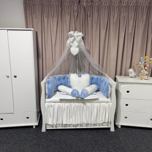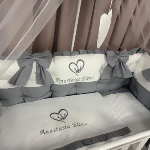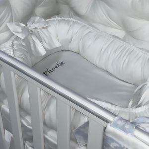 Set complet 11 piese pentru pătuț – model Royal White Grey din bumbac 100% moale, personalizabil cu nume – Lenjerie premium Peppi Bambini