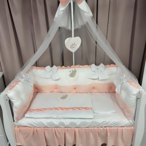 Lenjerie pătuț 11 piese Royal Catifea White Somon – Set complet personalizabil din catifea moale și bumbac natural PeppiBambini