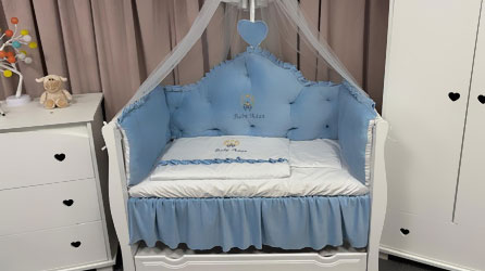 Lenjerie pătuț personalizată 11 piese Regal Catifea Blue PeppiBambini – set premium albastru din catifea moale, broderie personalizată și confort total pentru bebeluși
