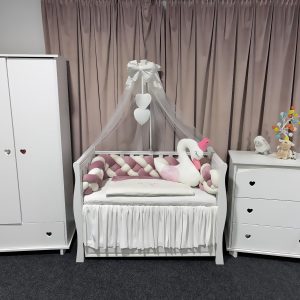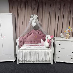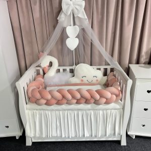 Lenjerie pătuț personalizată 11 piese cu laterale împletite Catifea Pink PeppiBambini cu Lebada – set premium roz pastel, catifea moale, broderie personalizată și protecție completă pentru bebeluși