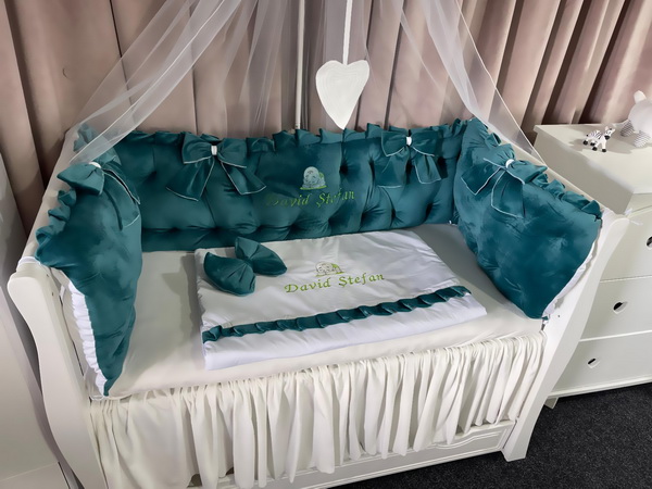 Creează o cameră de poveste pentru bebelușul tău cu setul Royal Verde Smarald PeppiBambini, o lenjerie de pat de lux pentru pătuț, realizată din catifea moale, matlasată și brodată elegant. 💎