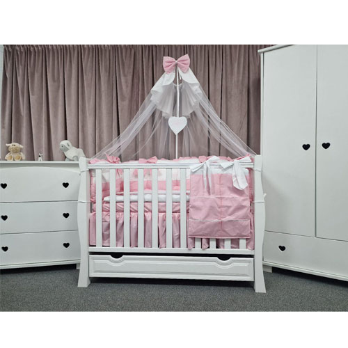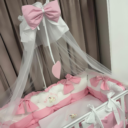 Lenjerie de pătuț 11 piese Royal White Pink din catifea moale – Set complet personalizabil , design elegant PeppiBambini
