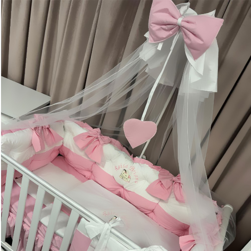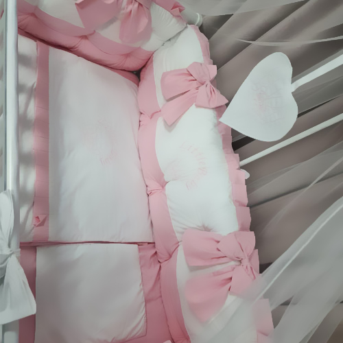 Transformă pătuțul bebelușului tău într-un mic palat cu setul Royal White Pink de la PeppiBambini – un model emblematic, creat cu grijă și rafinament în atelierele din România.