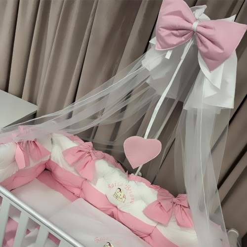 Culoarea delicată de roz pastel, în contrast cu albul imaculat, aduce un aer nobil camerei bebelușului, inspirat din decorurile regale. Țesăturile premium din bumbac 100% natural și catifea fină oferă o senzație plăcută la atingere, iar personalizarea cu numele copilului transformă setul într-un cadou unic și emoționant.