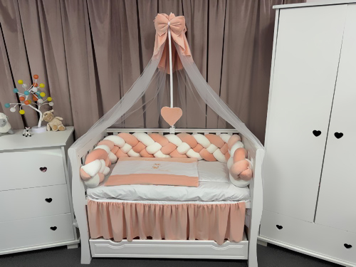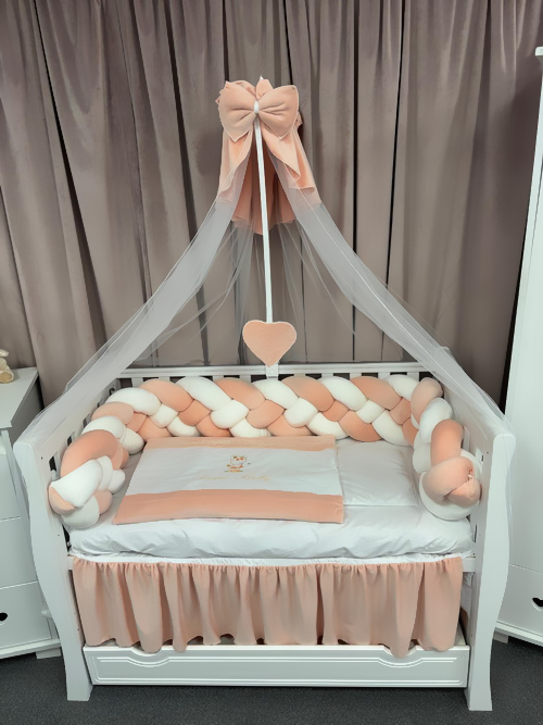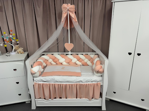 Creează un colț de poveste pentru micuțul tău cu lenjeria de pătuț PeppiBambini din catifea somon, un set complet de 11 piese realizat manual în România, gândit pentru confort, siguranță și eleganță.