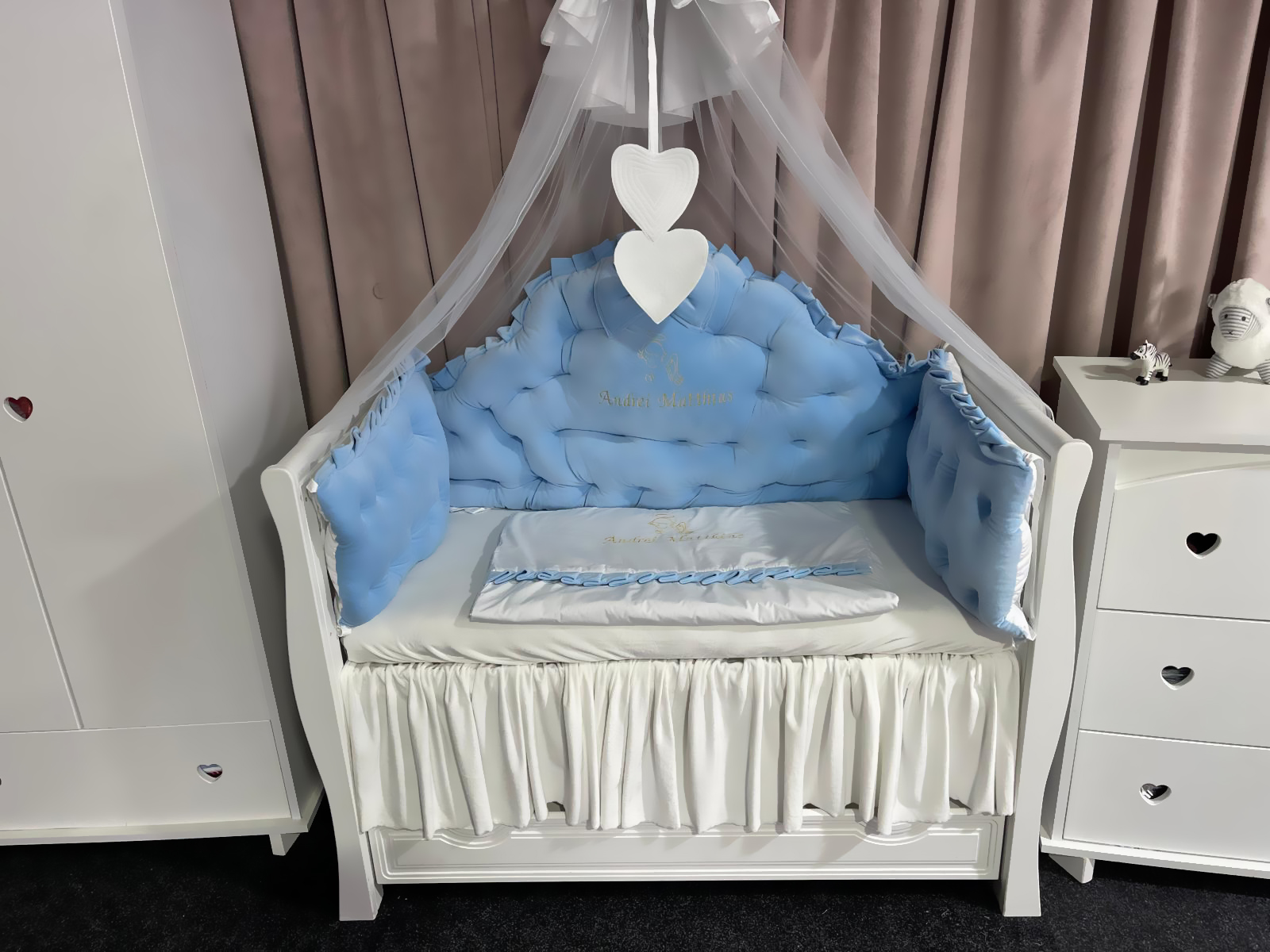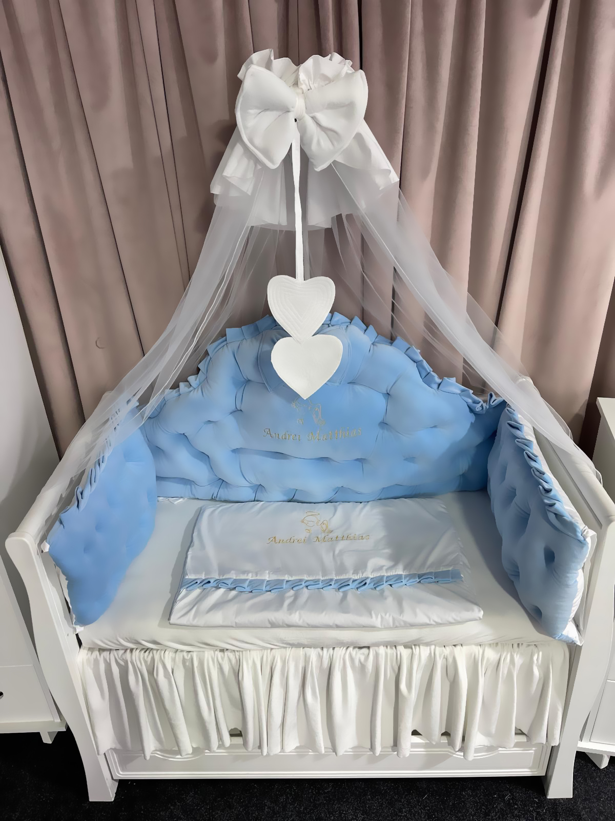 ✨ Personalizare inclusă: poți adăuga numele bebelușului brodat pe pernă sau apărătoare.