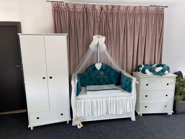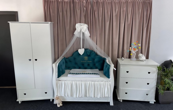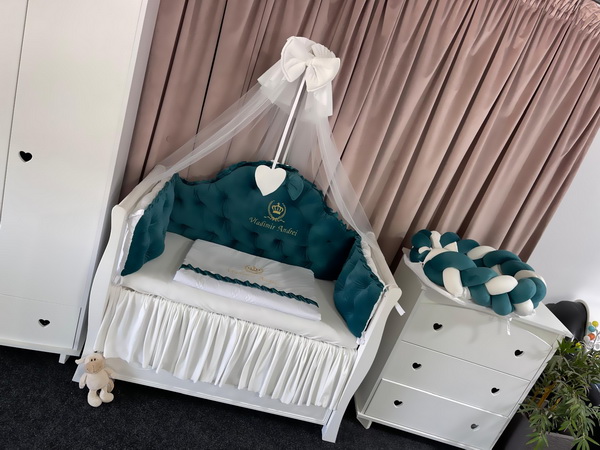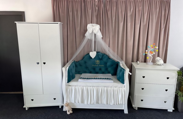 Detaliile atent lucrate și nuanța verde smarald transformă pătuțul într-un adevărat colț regal al camerei copilului tău.