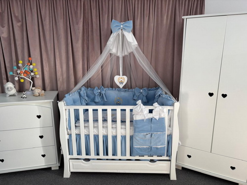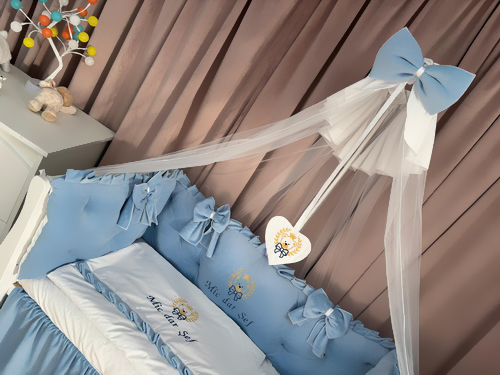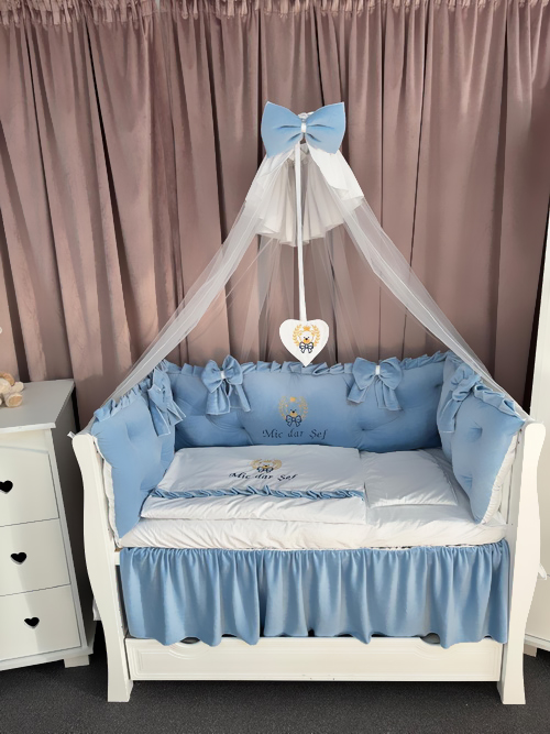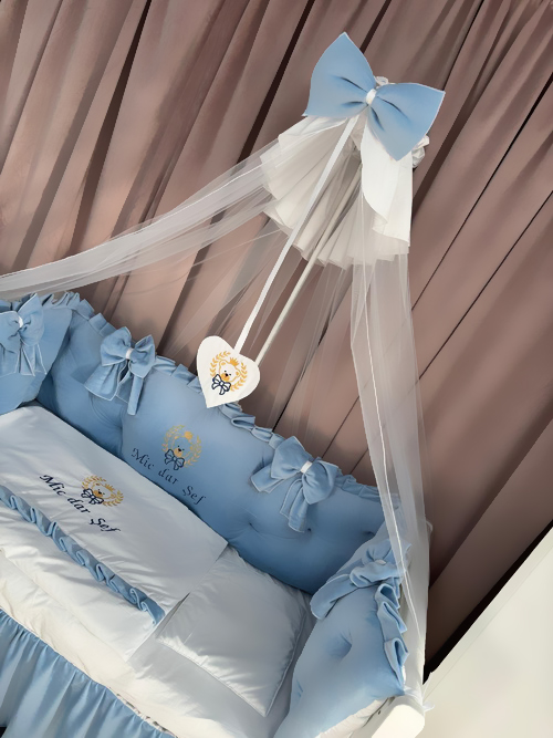 Fiecare detaliu este lucrat manual, cu grijă, pentru ca bebelușul tău să doarmă într-un mediu plin de tandrețe și rafinament.