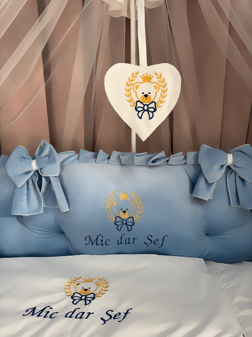 Ideal pentru băieței, setul Royal Catifea Blue aduce o notă nobilă în camera copilului, datorită combinației de albastru intens și alb imaculat, finisajelor perfecte și broderiilor delicate.