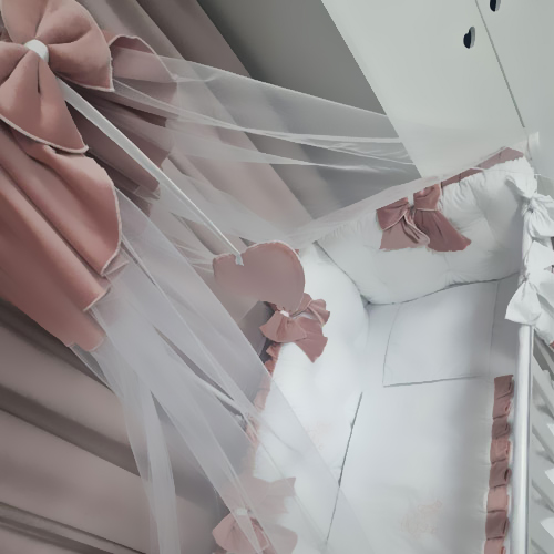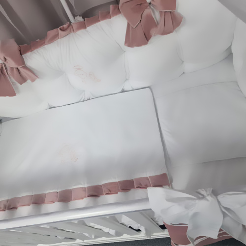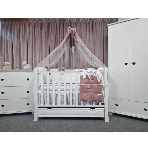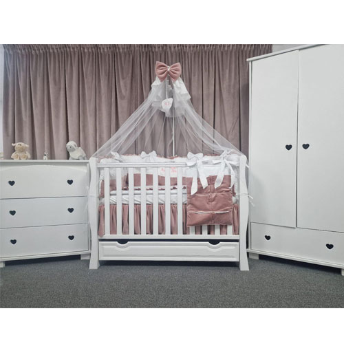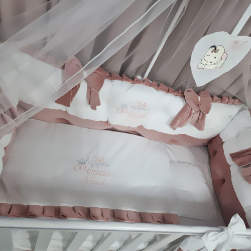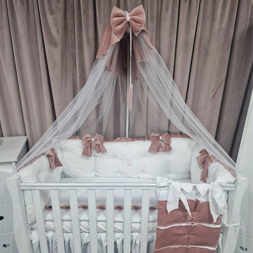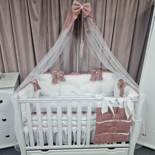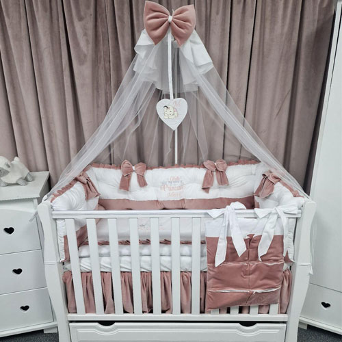 Modelul Royal Catifea Pink impresionează prin culoarea roz pudrat elegant, texturile luxoase și broderiile fine care transformă pătuțul într-un colț de poveste.