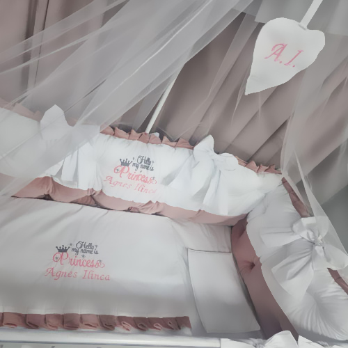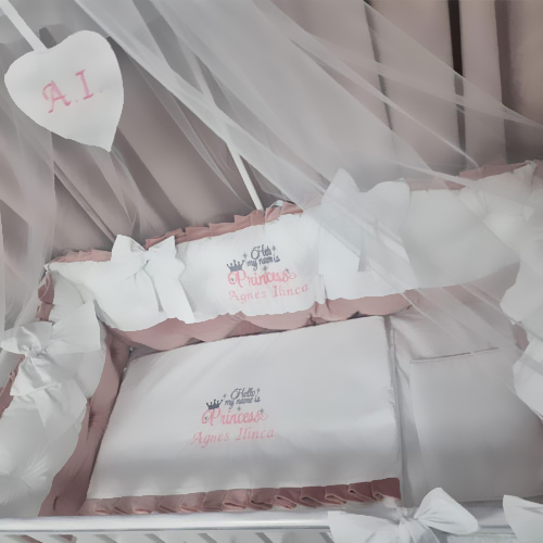 💖 Personalizare inclusă: numele bebelușului poate fi brodat manual pe pernă sau apărătoare.