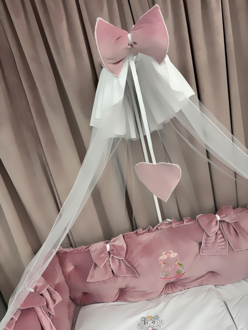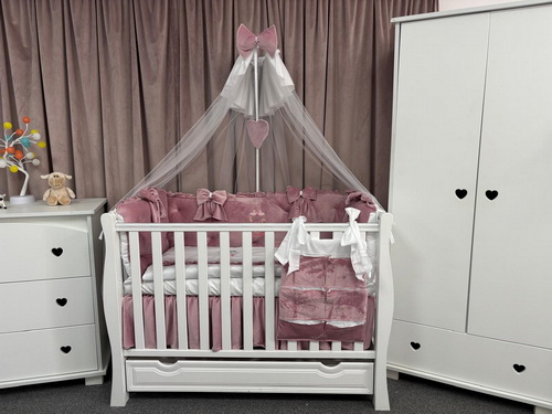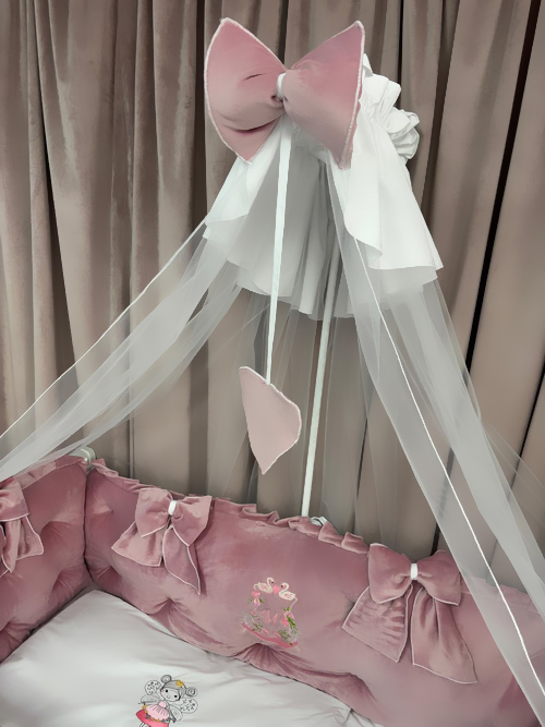 Catifeaua moale de culoare roz pastel oferă o notă sofisticată camerei, iar bumbacul natural asigură respirabilitate și confort maxim pentru bebeluș.