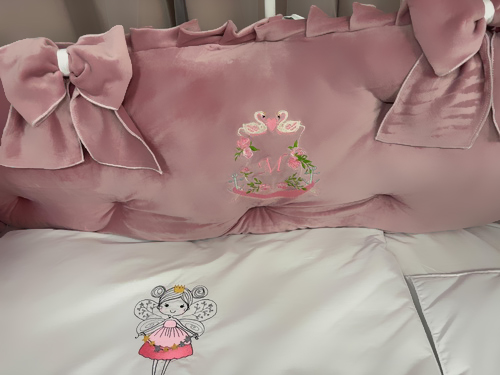 Broderiile fine, fundele decorative și finisajele manuale transformă pătuțul într-un adevărat colț de poveste.