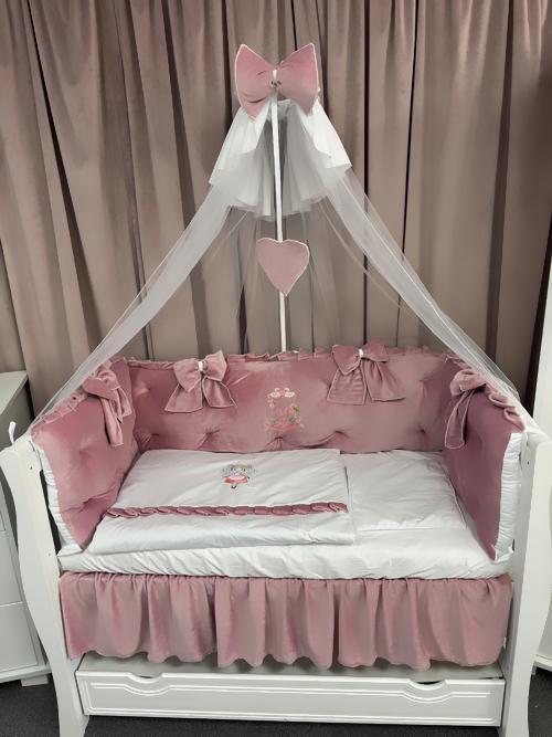 Lenjerie pătuț 11 piese Royal Catifea Pink – Set complet personalizabil din catifea moale și bumbac premium PeppiBambini