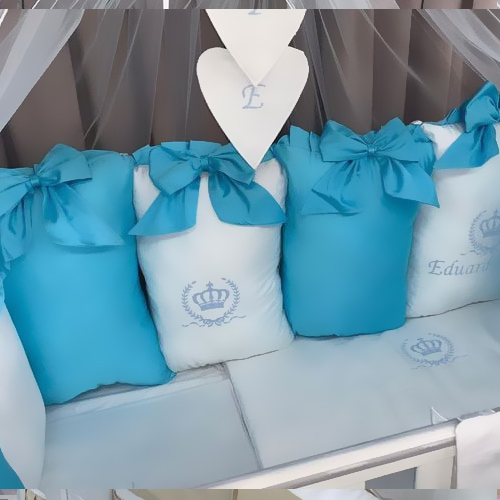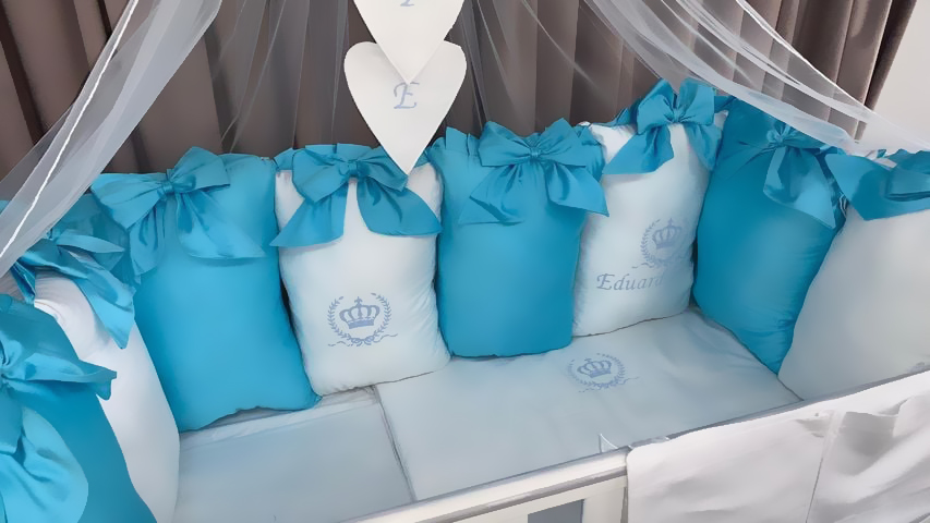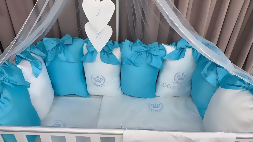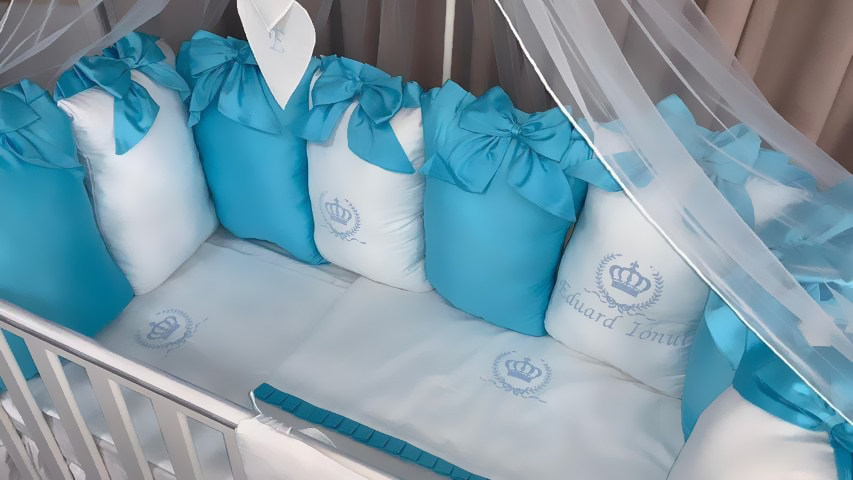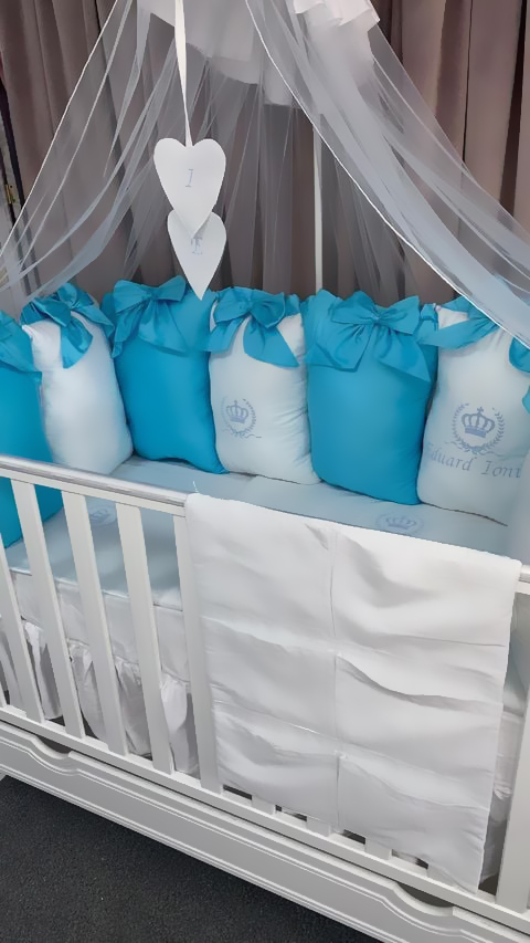 Transformă camera copilului într-un spațiu elegant și luminos cu setul Royal Prince Turquoise de la PeppiBambini, o lenjerie de pat completă pentru bebeluși, creată special pentru a oferi protecție, căldură și rafinament.
