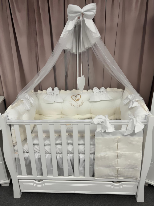 Oferă-i bebelușului tău confortul și eleganța meritate cu setul Royal White PeppiBambini, o lenjerie de pătuț completă și personalizabilă, creată cu grijă din bumbac 100% natural și catifea moale premium.