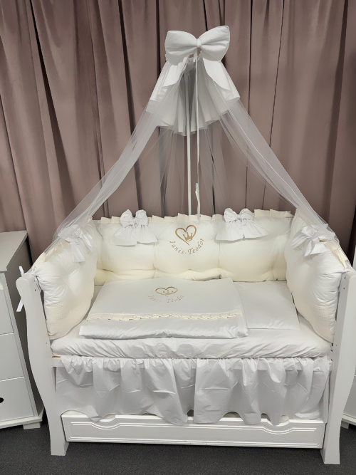 Lenjerie pătuț 11 piese Royal White – Set complet personalizabil din bumbac premium și catifea moale PeppiBambini