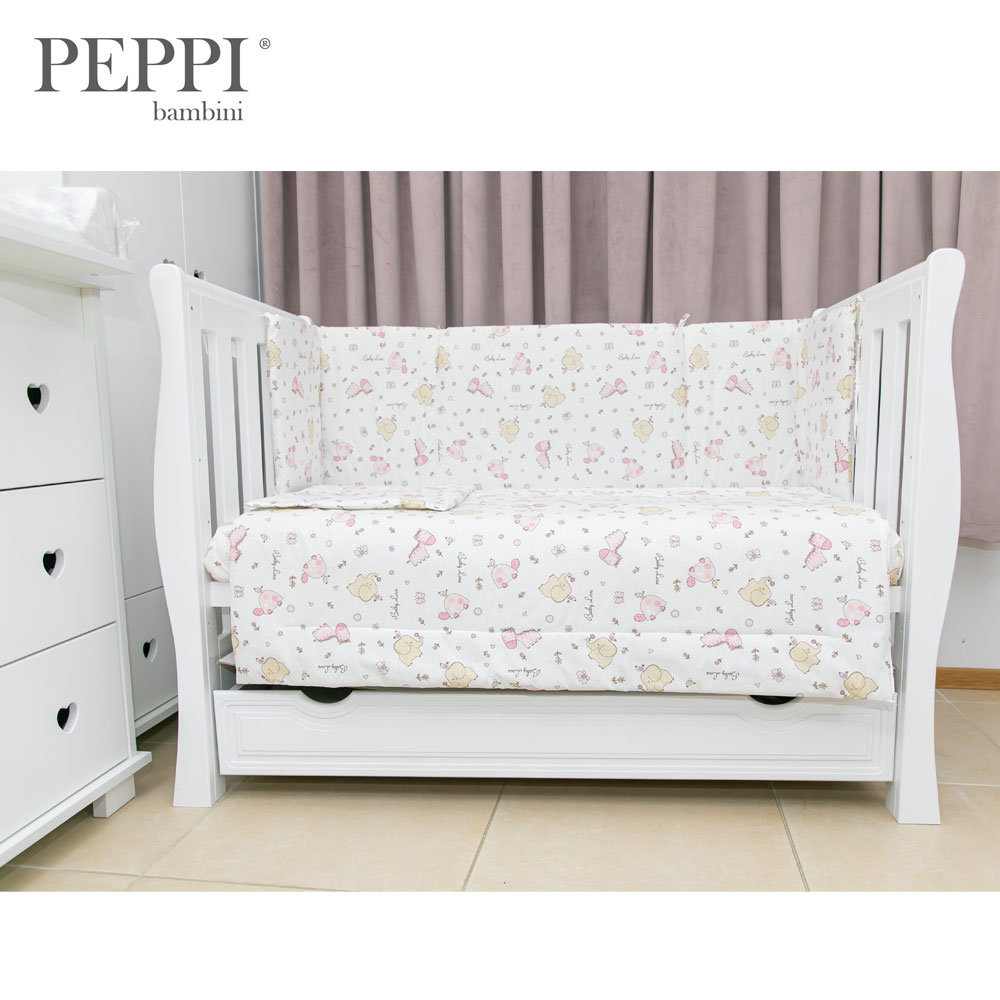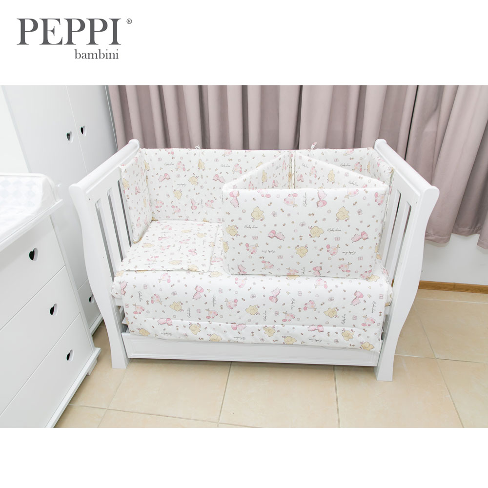Creează un colț de poveste pentru fetița ta cu setul PeppiBambini Elephant Pink, o lenjerie de pătuț formată din 5 piese esențiale, confecționate din bumbac 100% natural, moale și sigur pentru pielea delicată a bebelușilor 🌿.