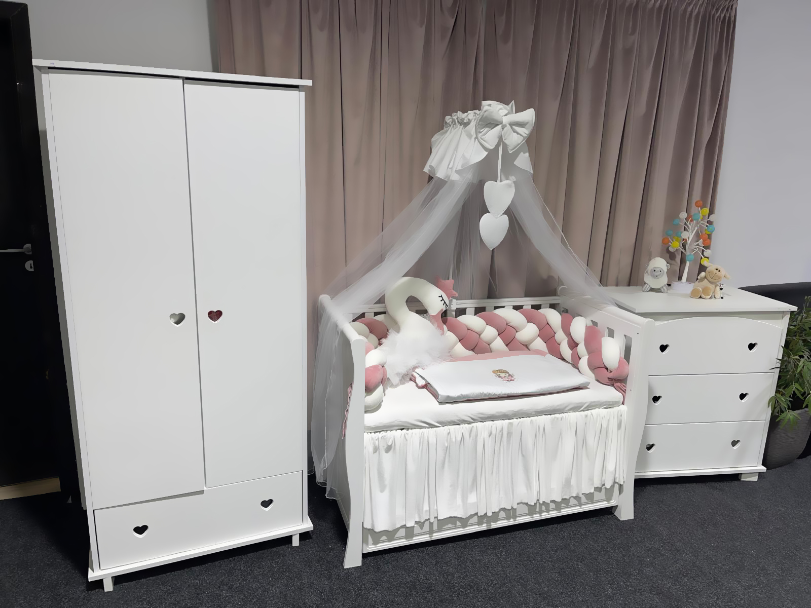 • Include: laterale împletite, apărători, pernă, pilotă, pernuțe decorative, baldachin, fundiță și suport