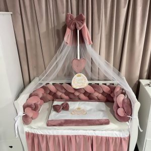 lenjerie pătuț bebeluși, laterale împletite pătuț, lenjerie catifea roz pastel, set premium pătuț bebe, lenjerie personalizată pentru bebeluși, PeppiBambini catifea pink, lenjerii antialergenice pentru bebeluși, seturi pătuț 11 piese, catifea moale pentru bebeluși, protecții împletite pătuț