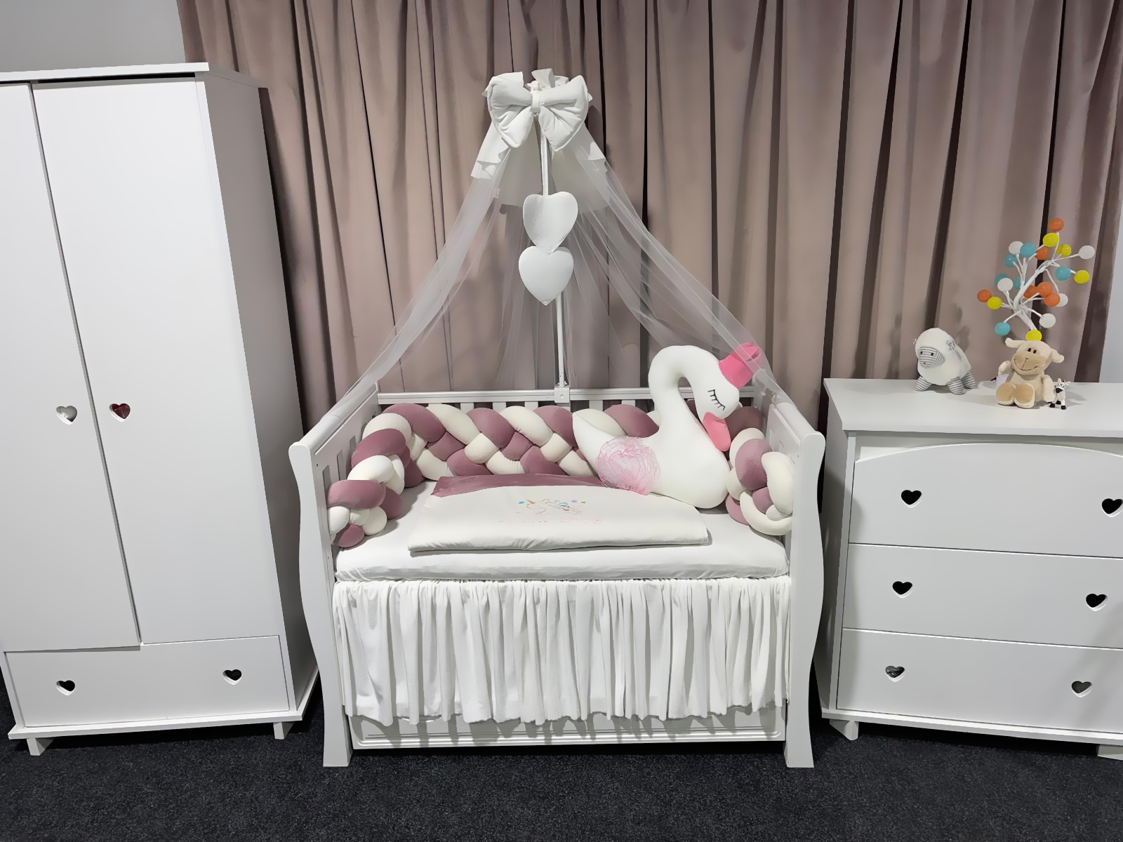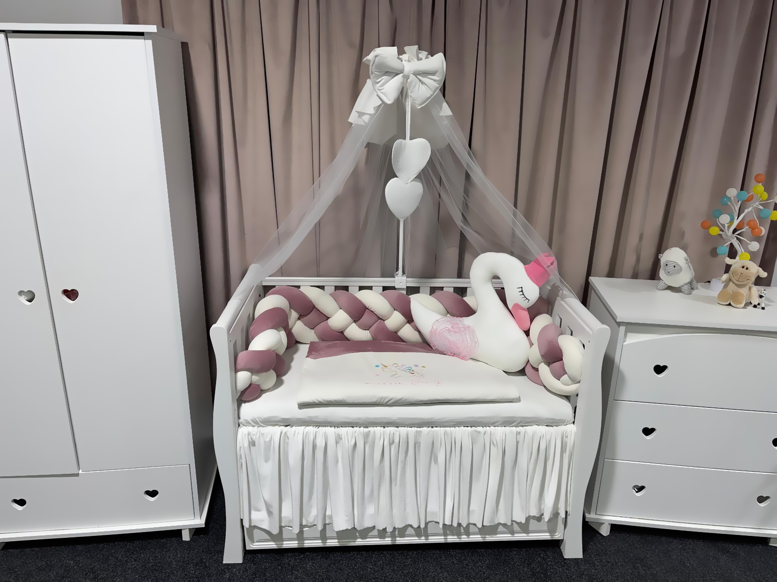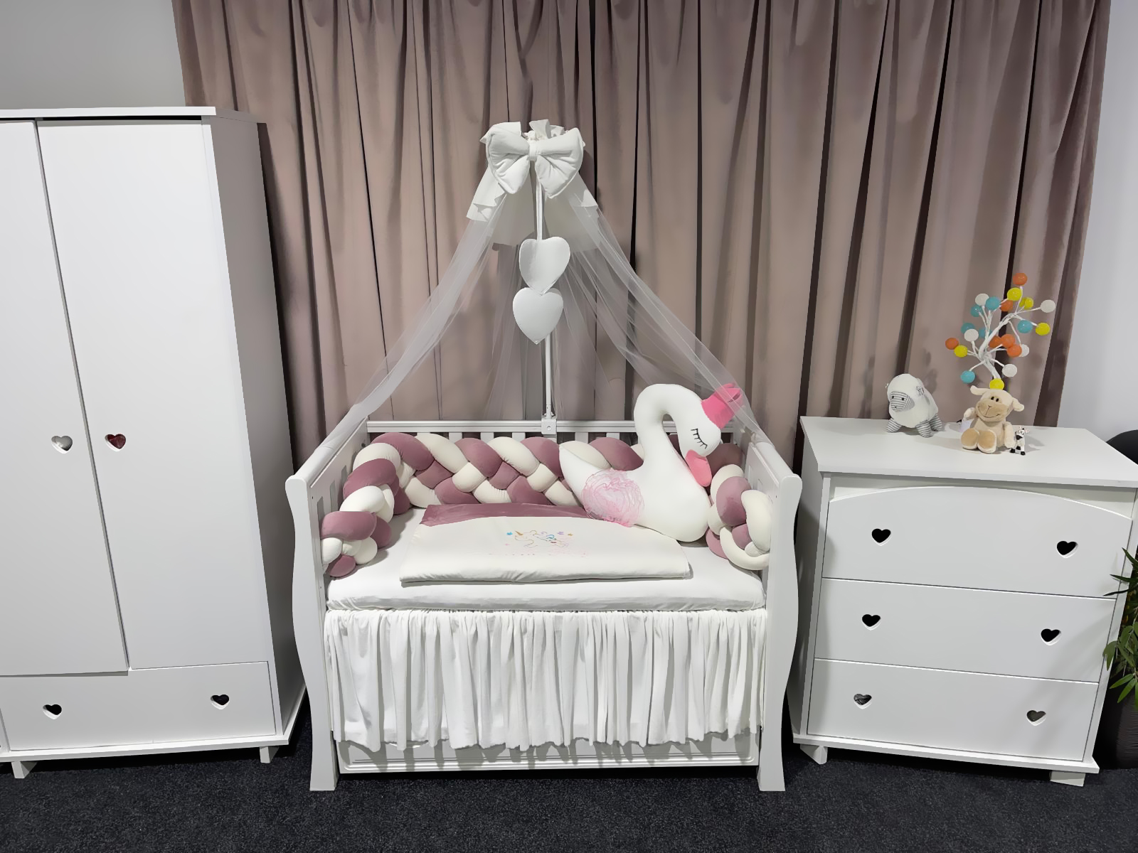 Modelul Catifea Pink este perfect pentru camere pastel, feminine, scandinave sau tematice. Rozul pastel dă o atmosferă liniștitoare și caldă, ideală pentru primele luni de viață.