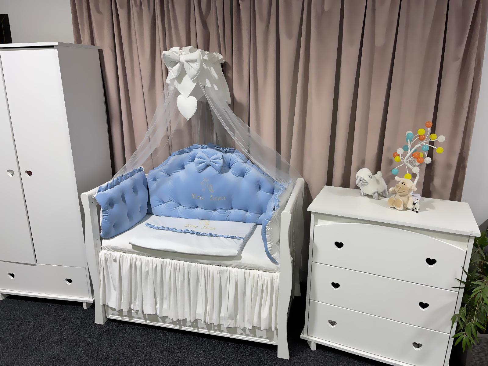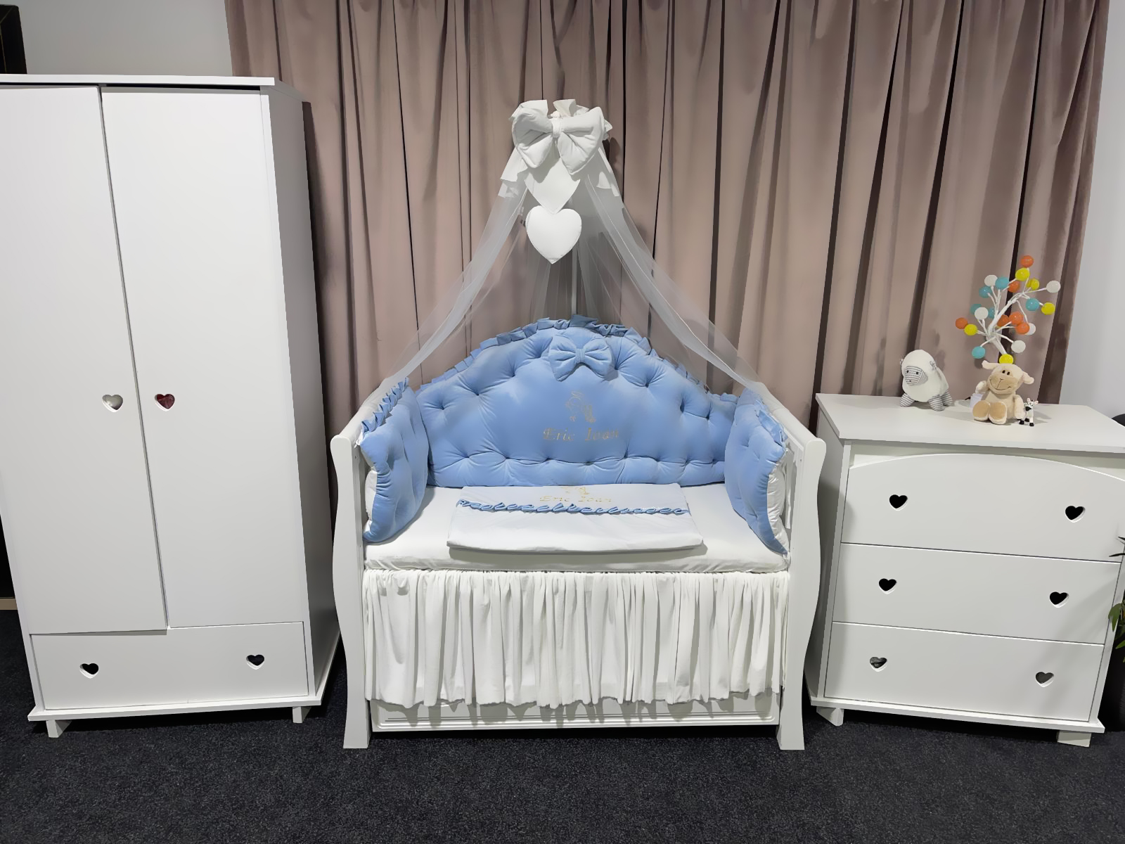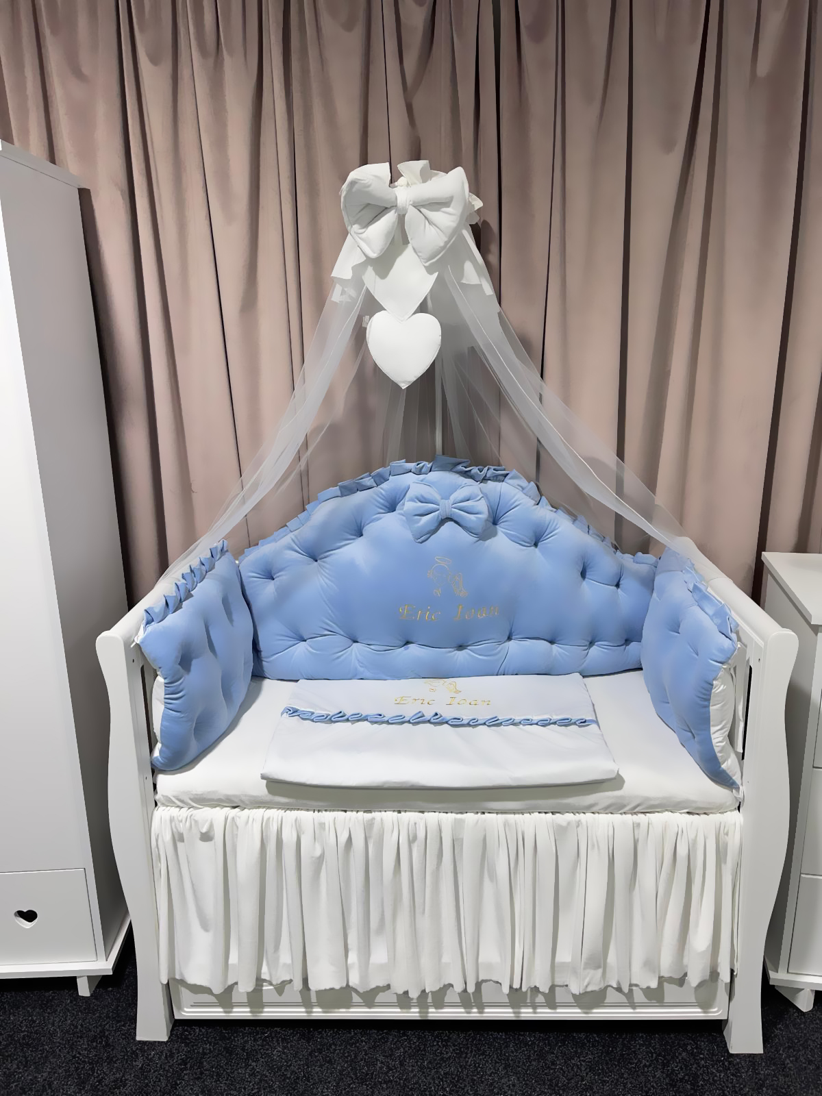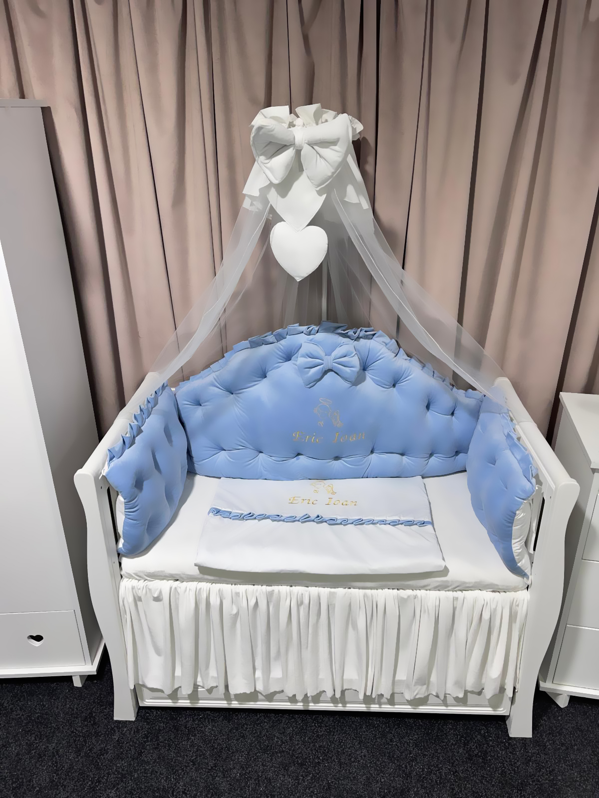 • Include: apărători, pernă, pilotă, pernuțe decorative, codițe, baldachin, fundiță și suport