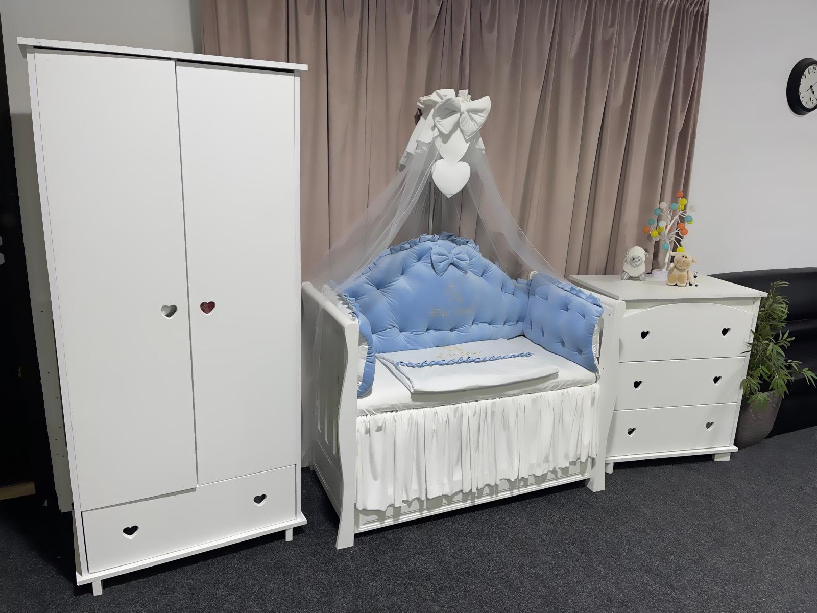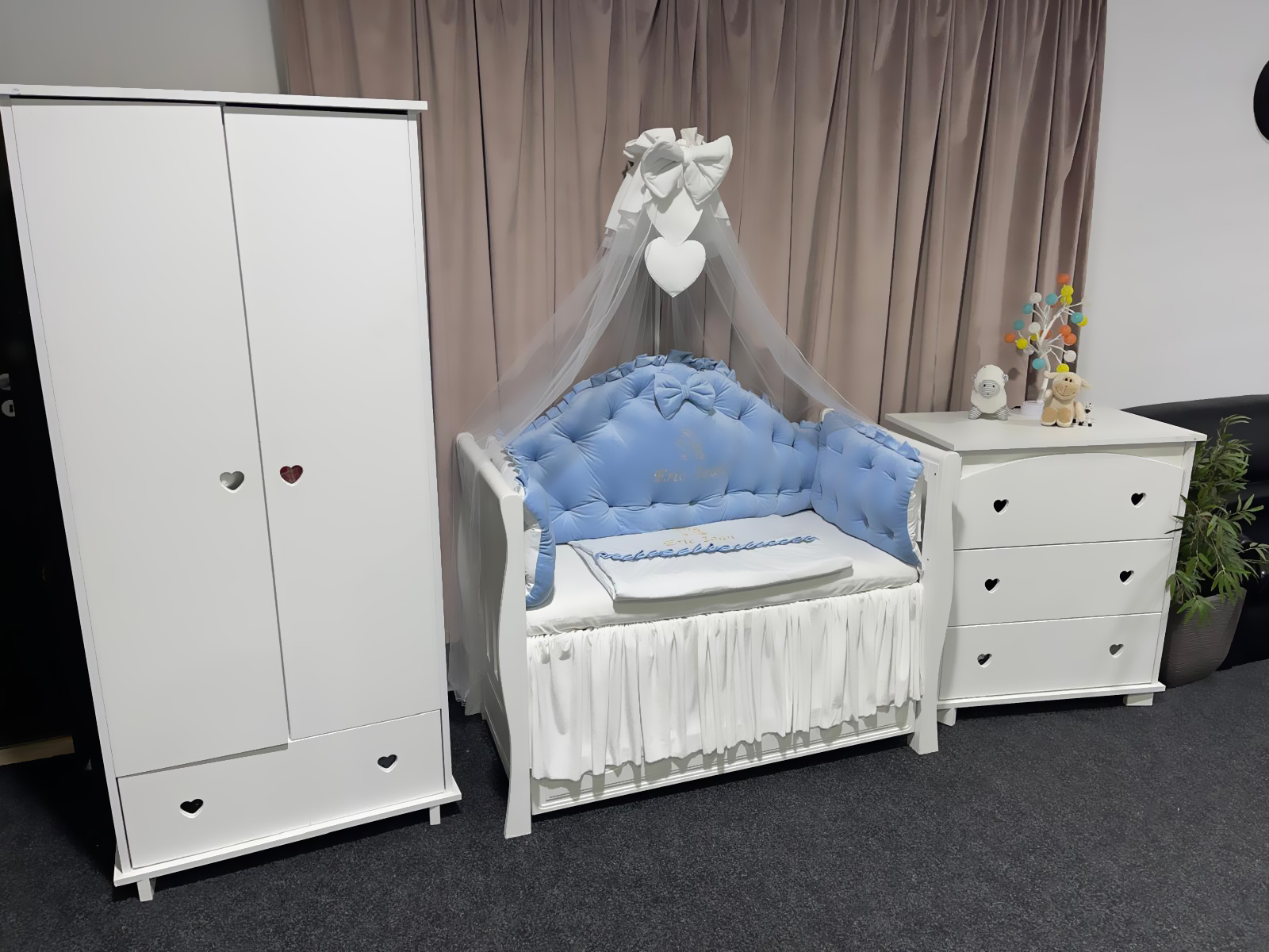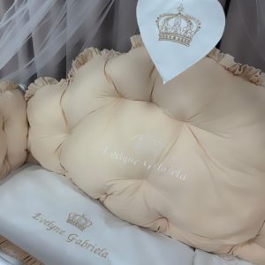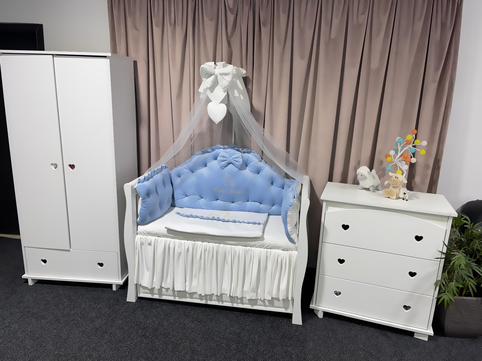 • Include: apărători, pernă, pilotă, pernuțe decorative, codițe, baldachin, fundiță și suport