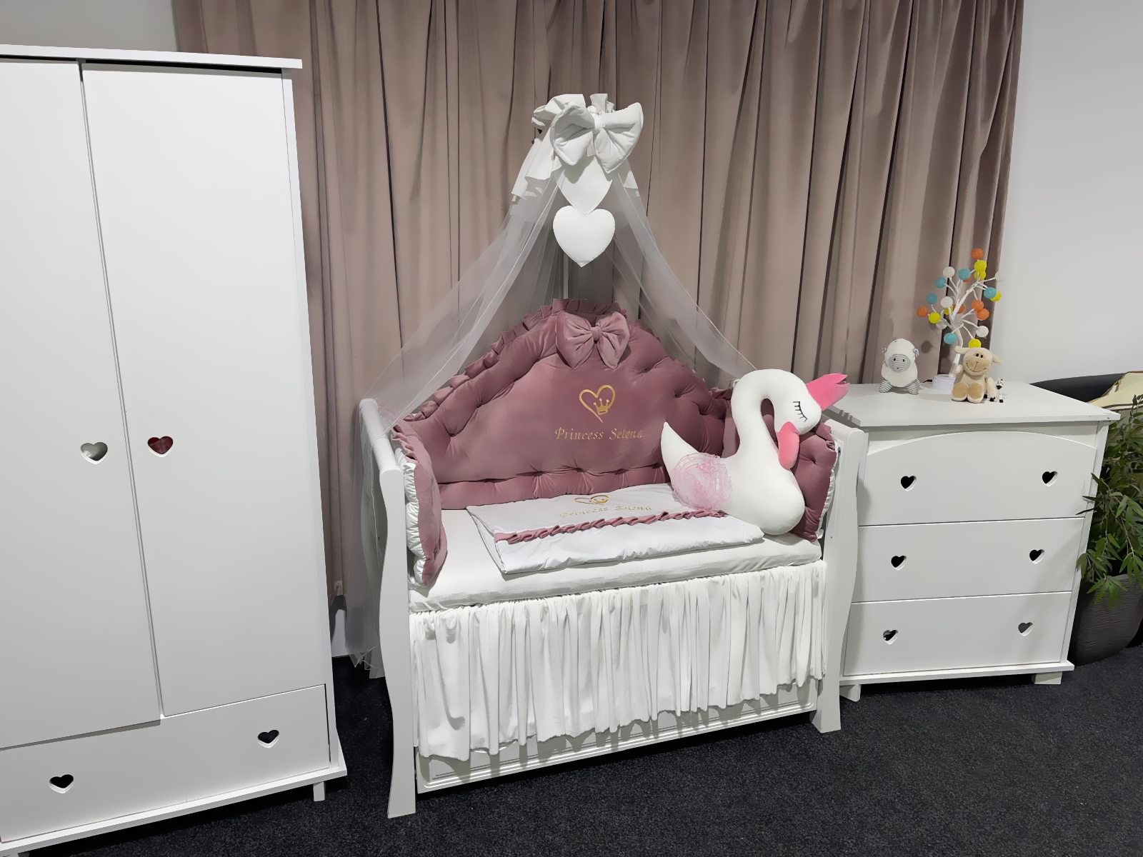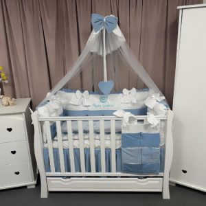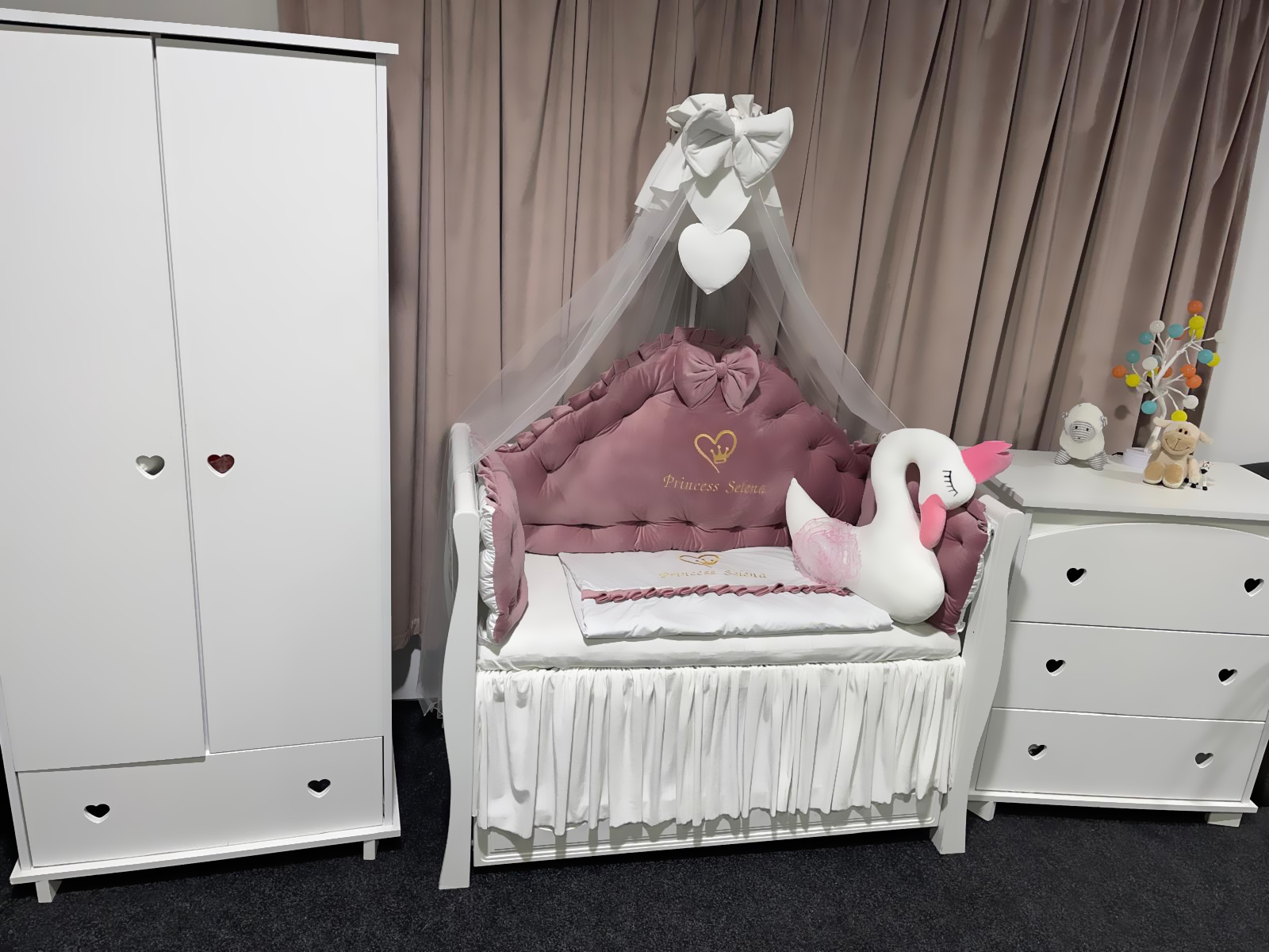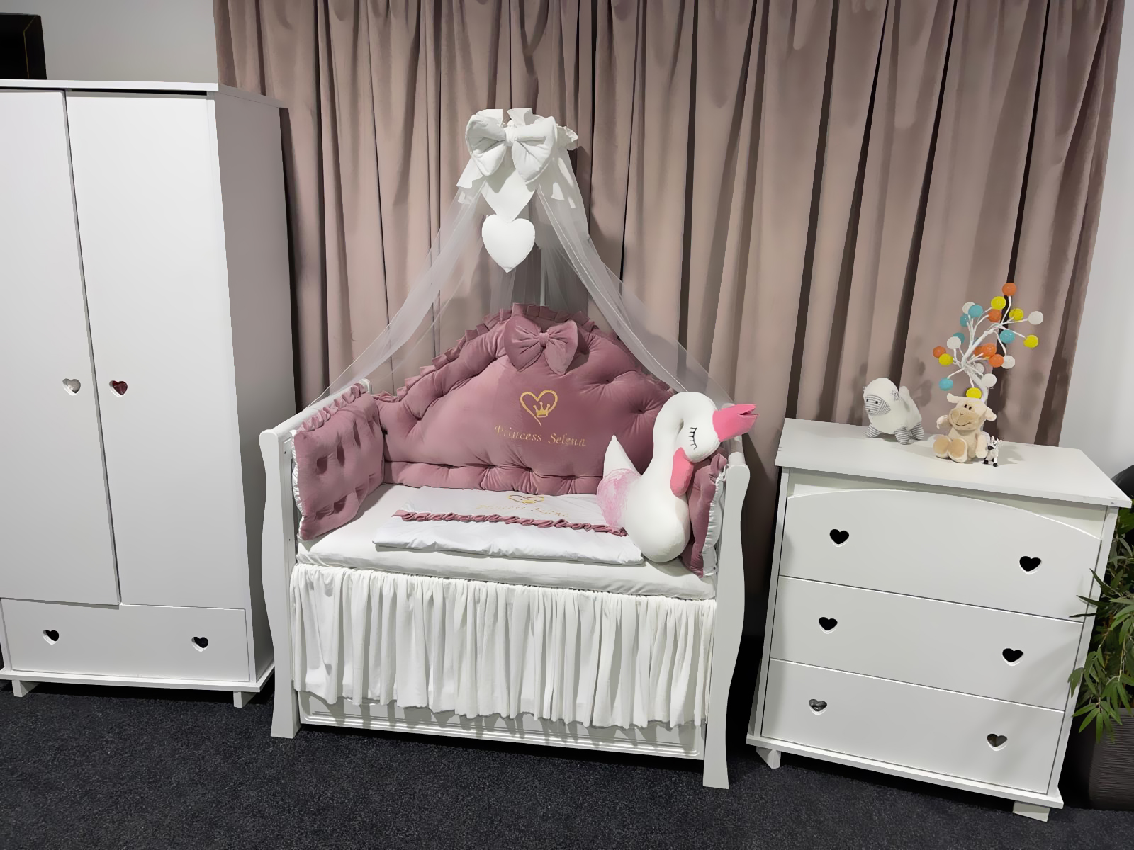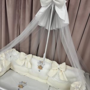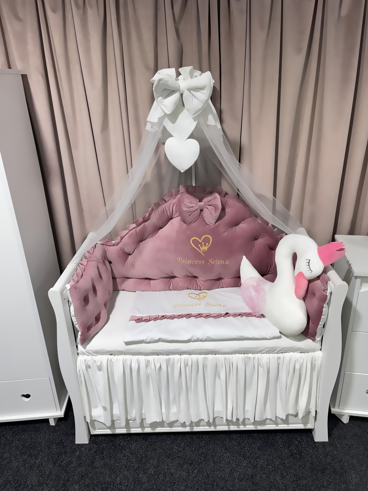 • Include: apărători, pernă, pilotă, 3 pernuțe, codițe, baldachin, fundiță și suport
