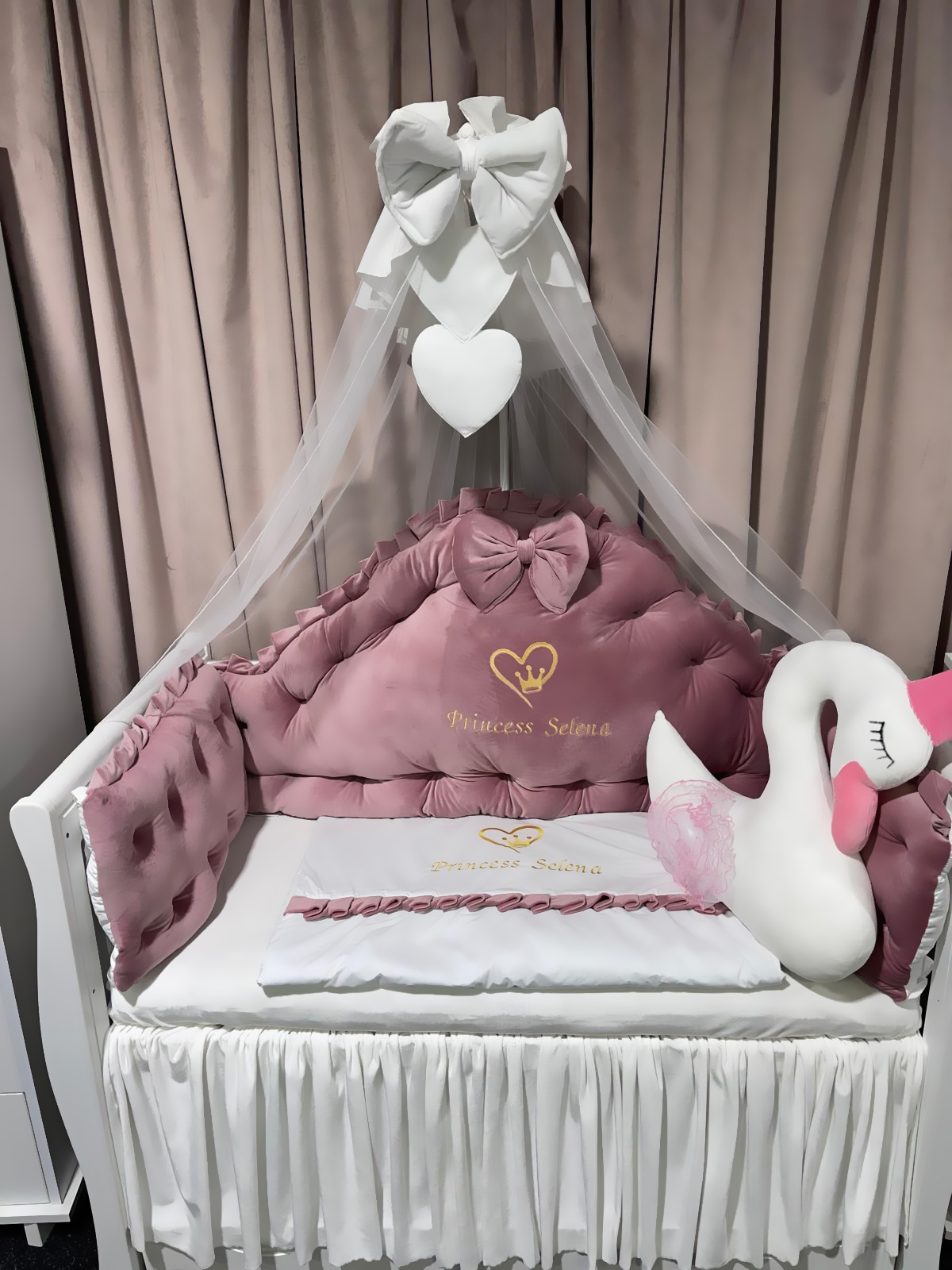 Lenjerie pătuț personalizată 11 piese Regal Catifea Pink PeppiBambini – set premium din catifea roz, broderie delicată, confort și protecție completă pentru bebeluși