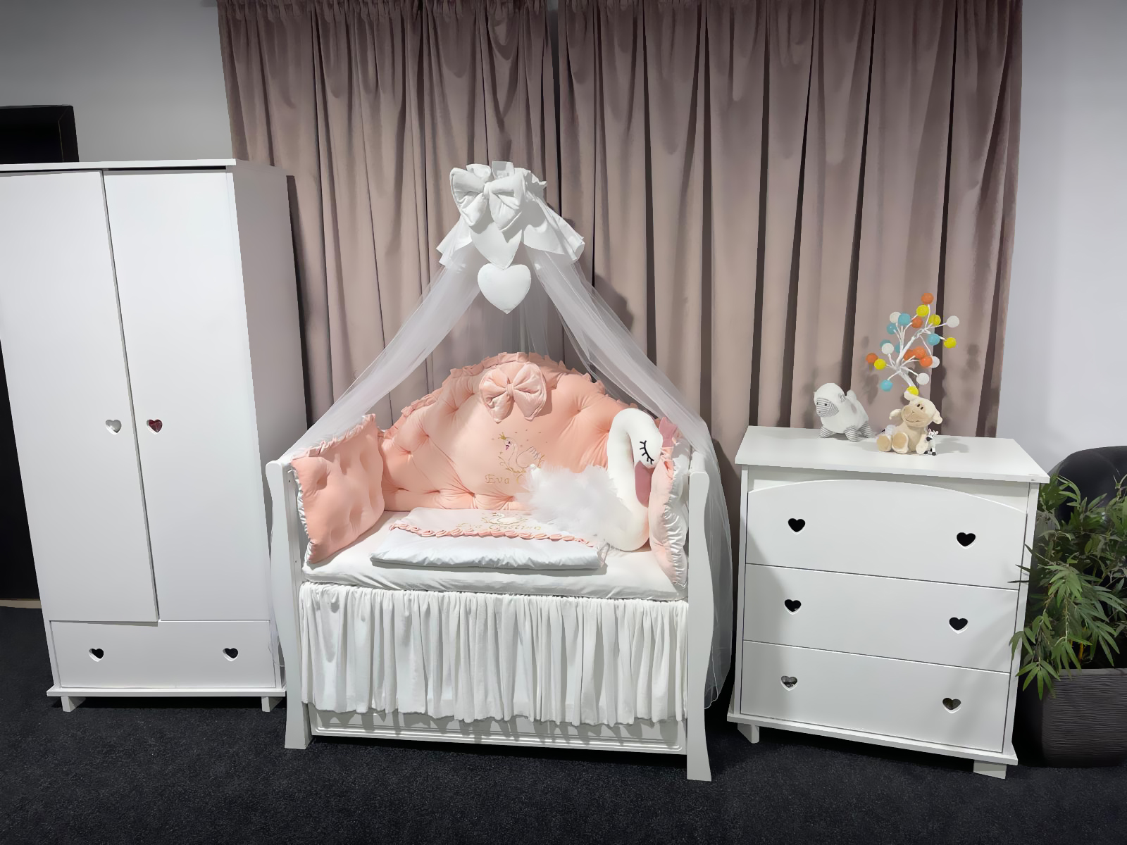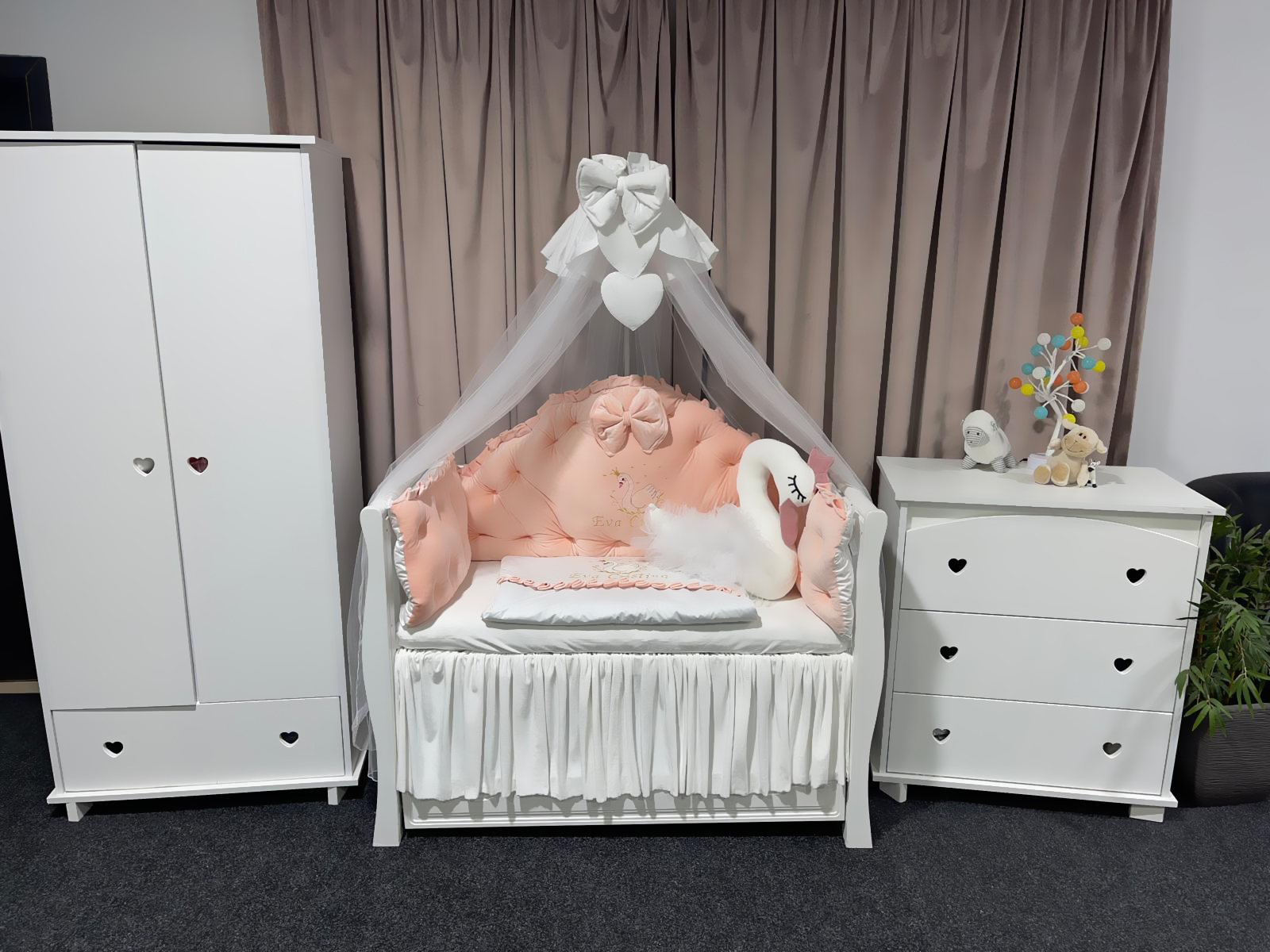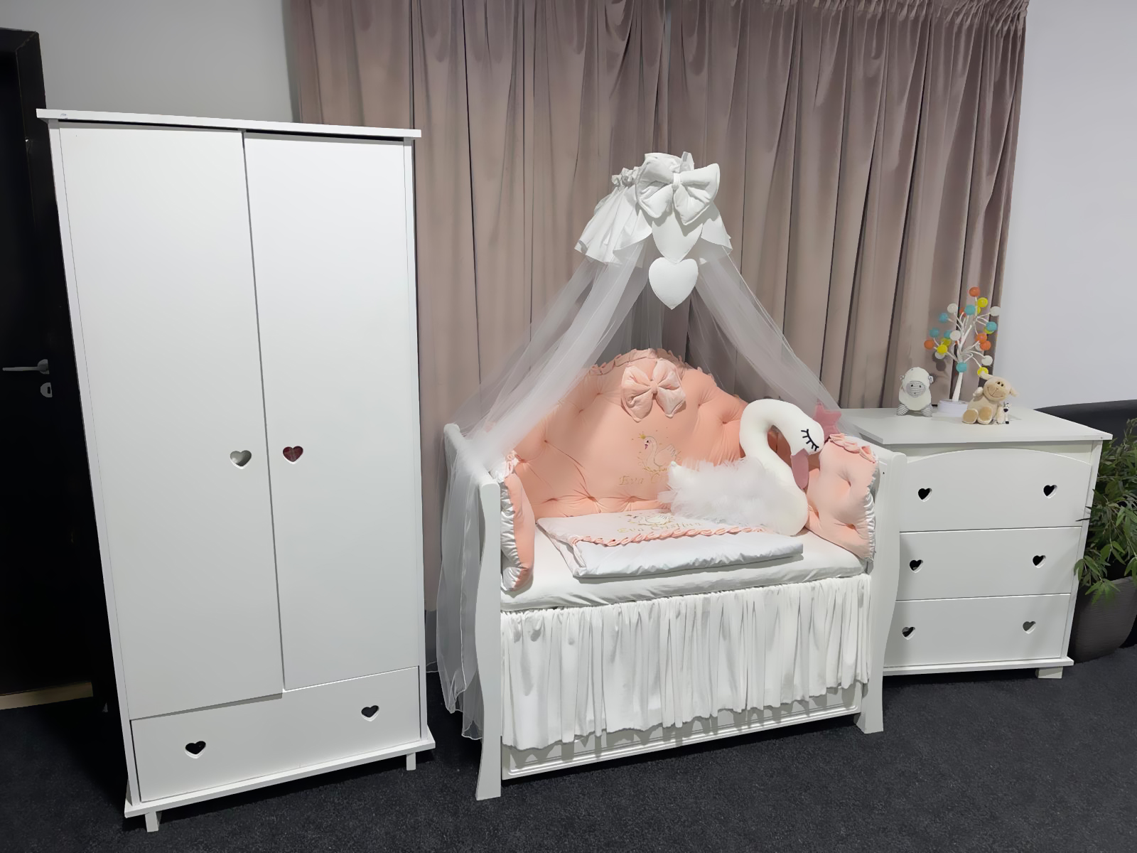 • Include apărători, pilotă, pernă, pernuțe, codițe, baldachin, fundiță și suport