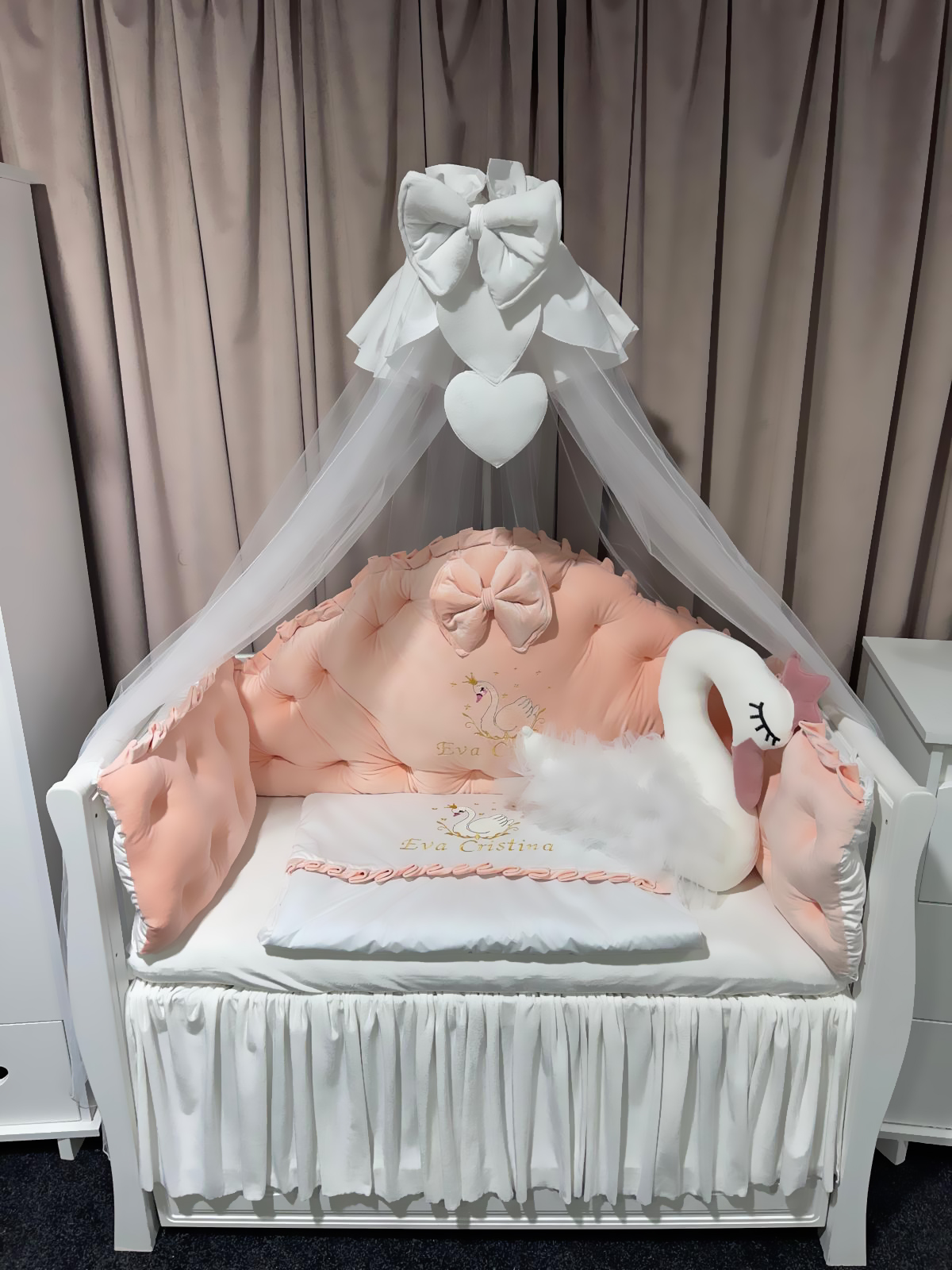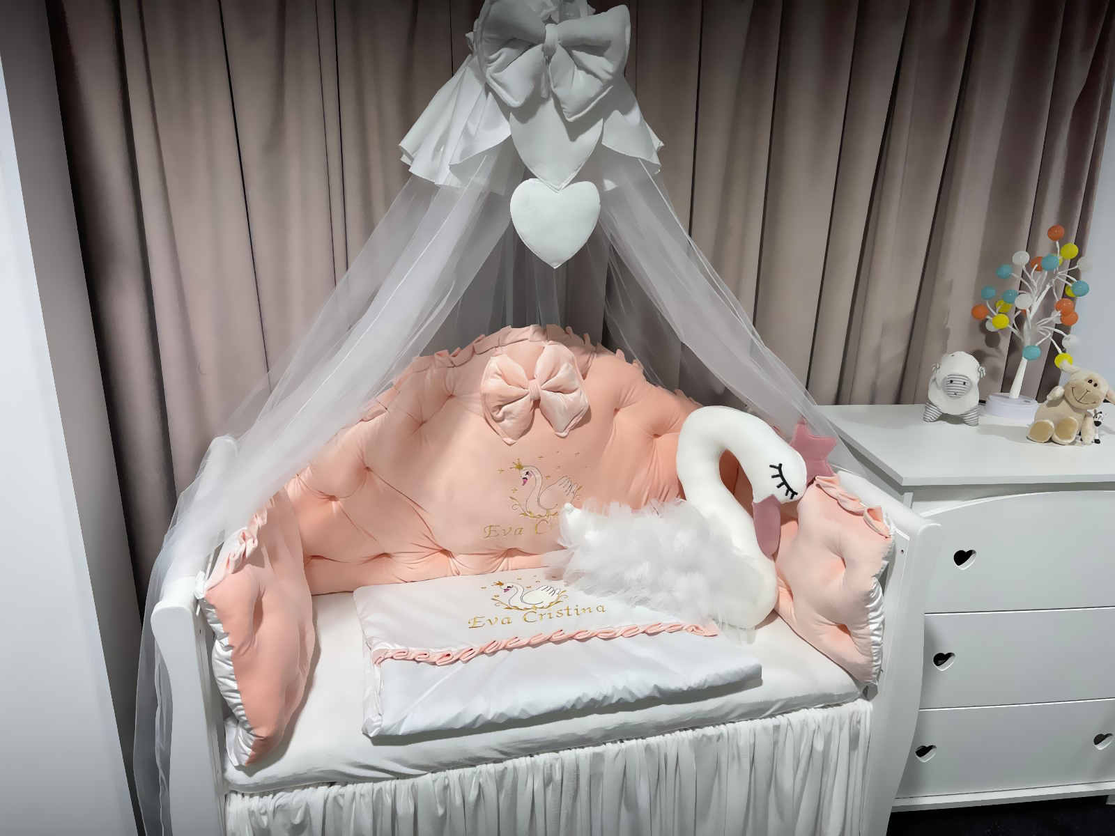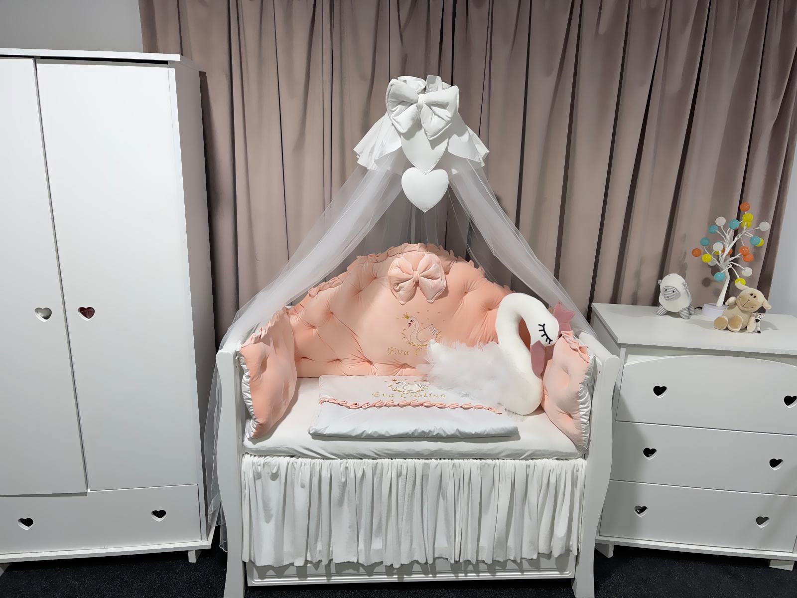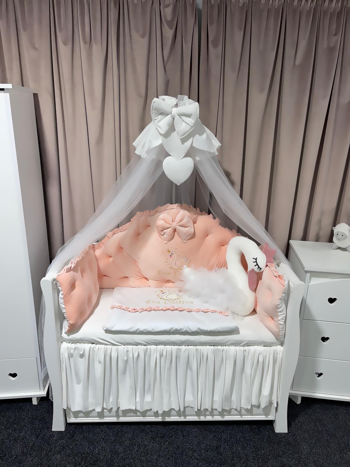Lenjerie pătuț personalizată 11 piese Regal Catifea Somon PeppiBambini cu Lebada – set premium din catifea somon, broderie personalizată și confort pentru bebeluși