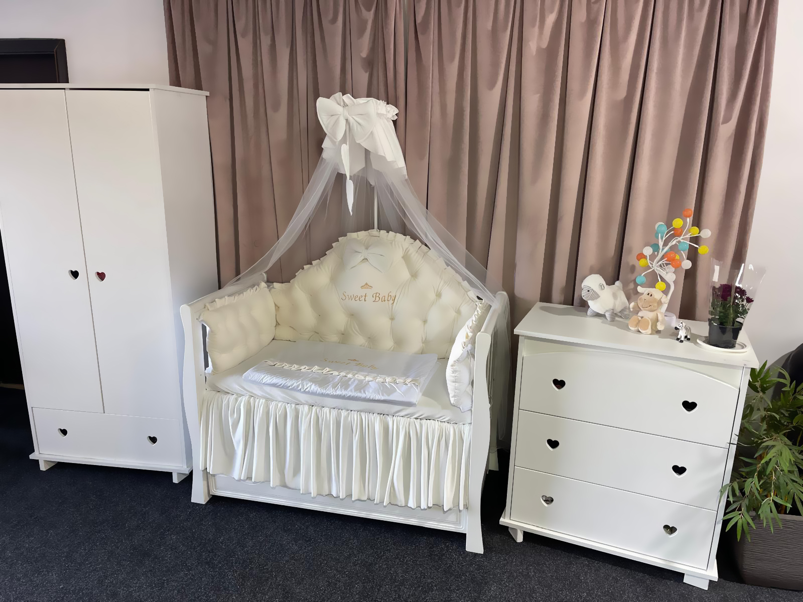Catifeaua albă folosită în acest model este moale, densă și foarte plăcută la atingere, iar broderia personalizată transformă setul într-un detaliu unic în camera bebelușului. Fiecare piesă este gândită pentru confort, protecție și eleganță.