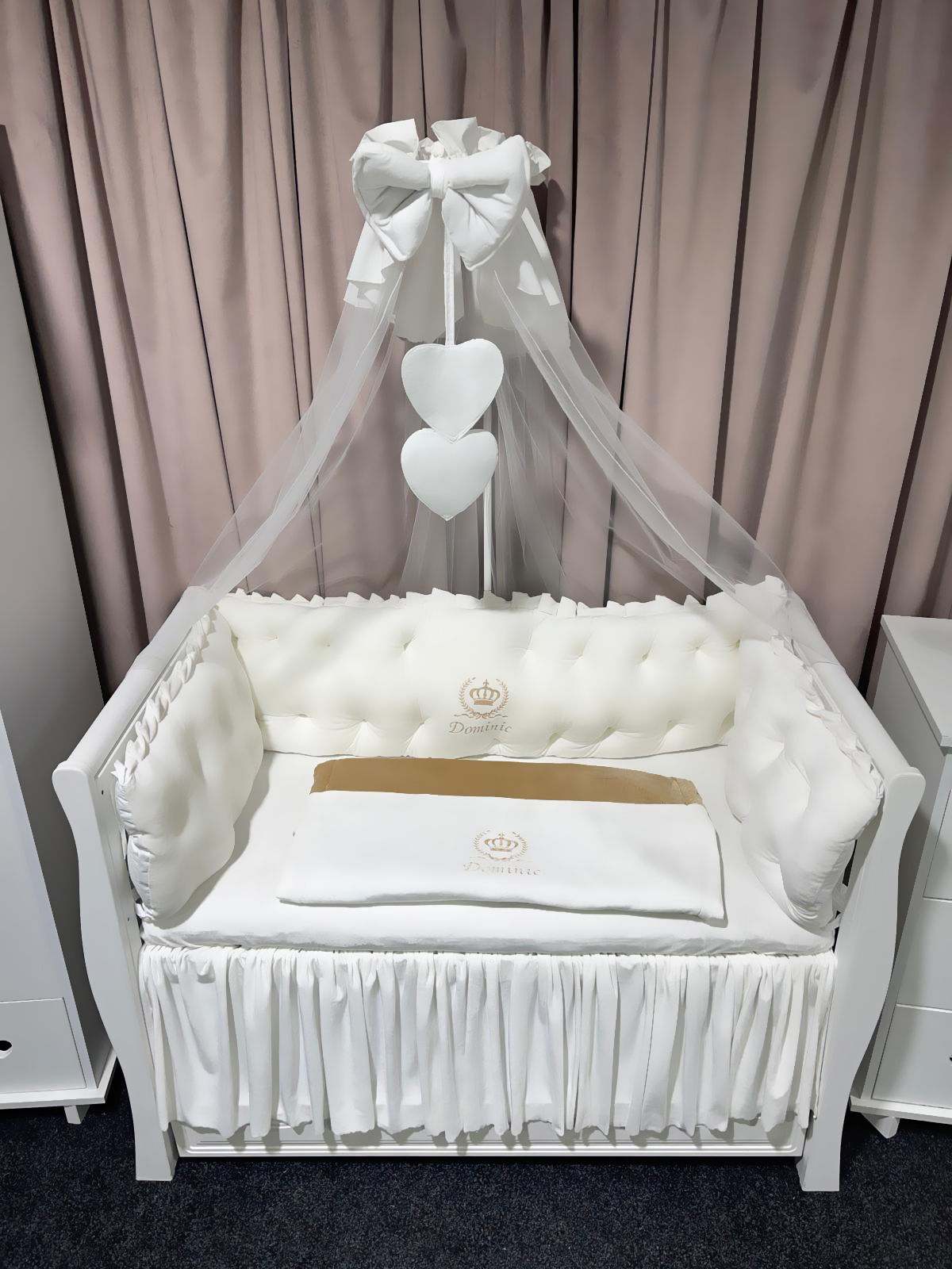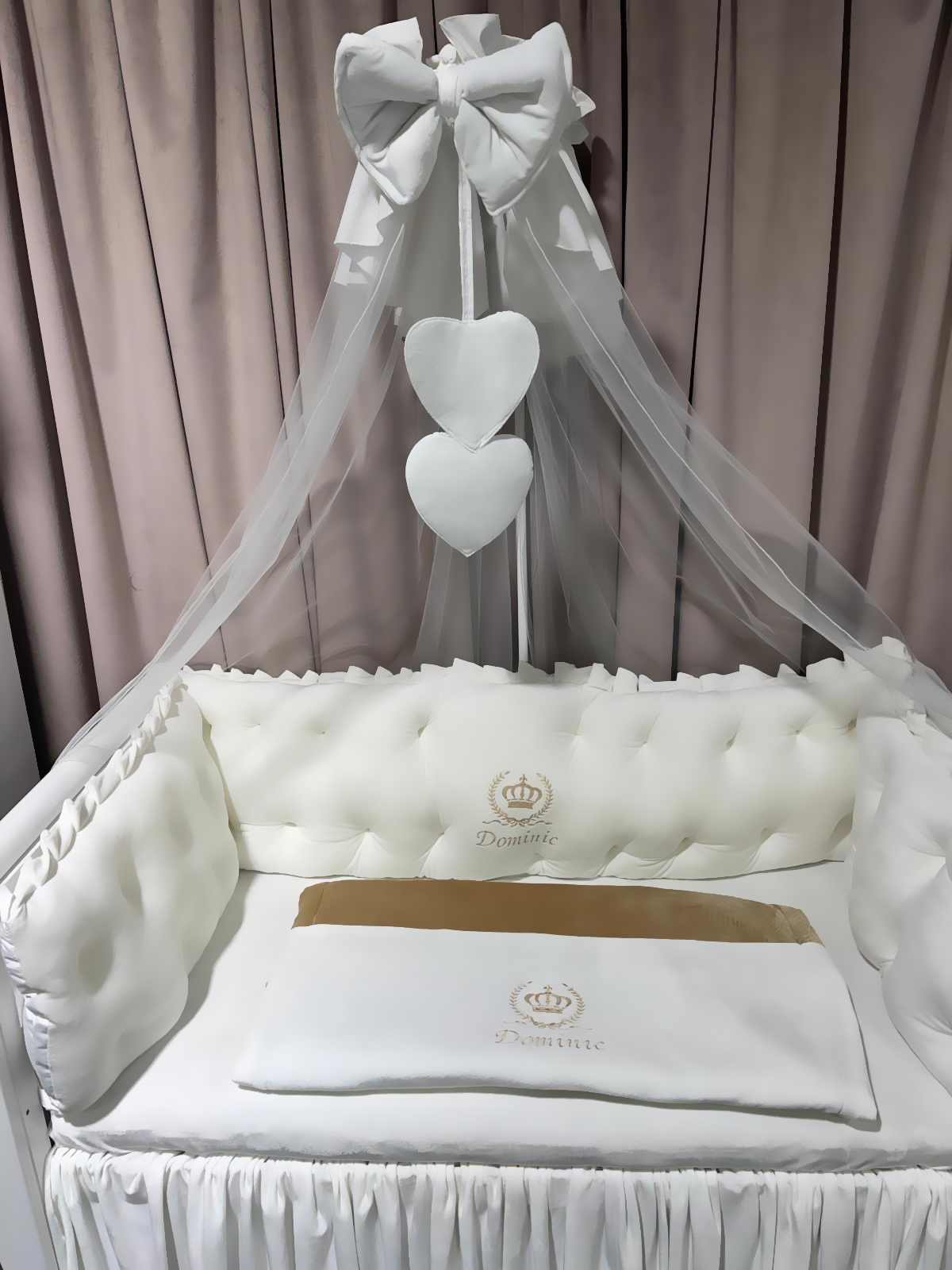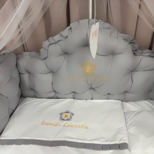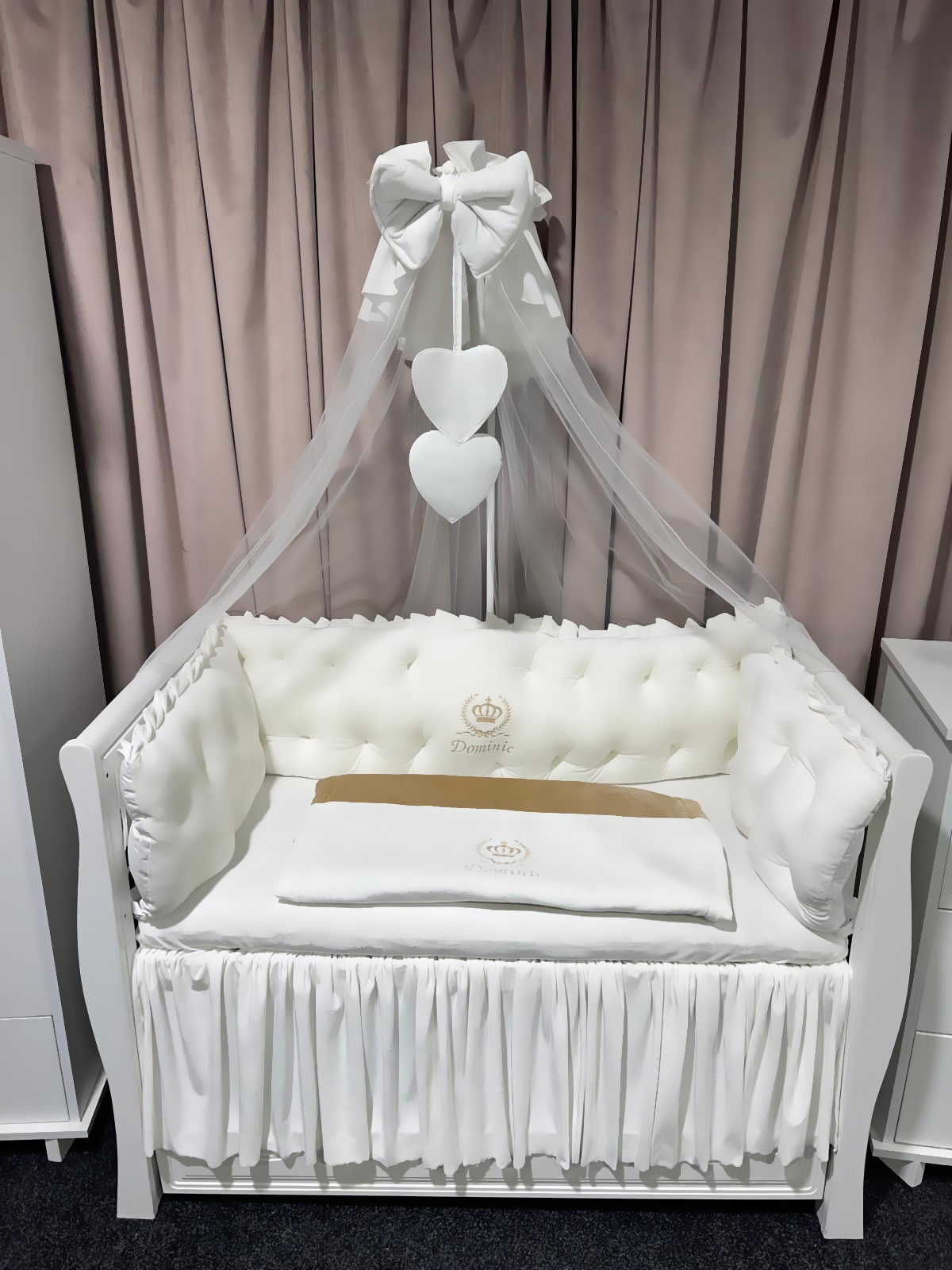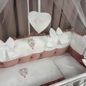 • Include: apărători, pernă, pilotă, pernuțe, codițe, baldachin, fundiță și suport