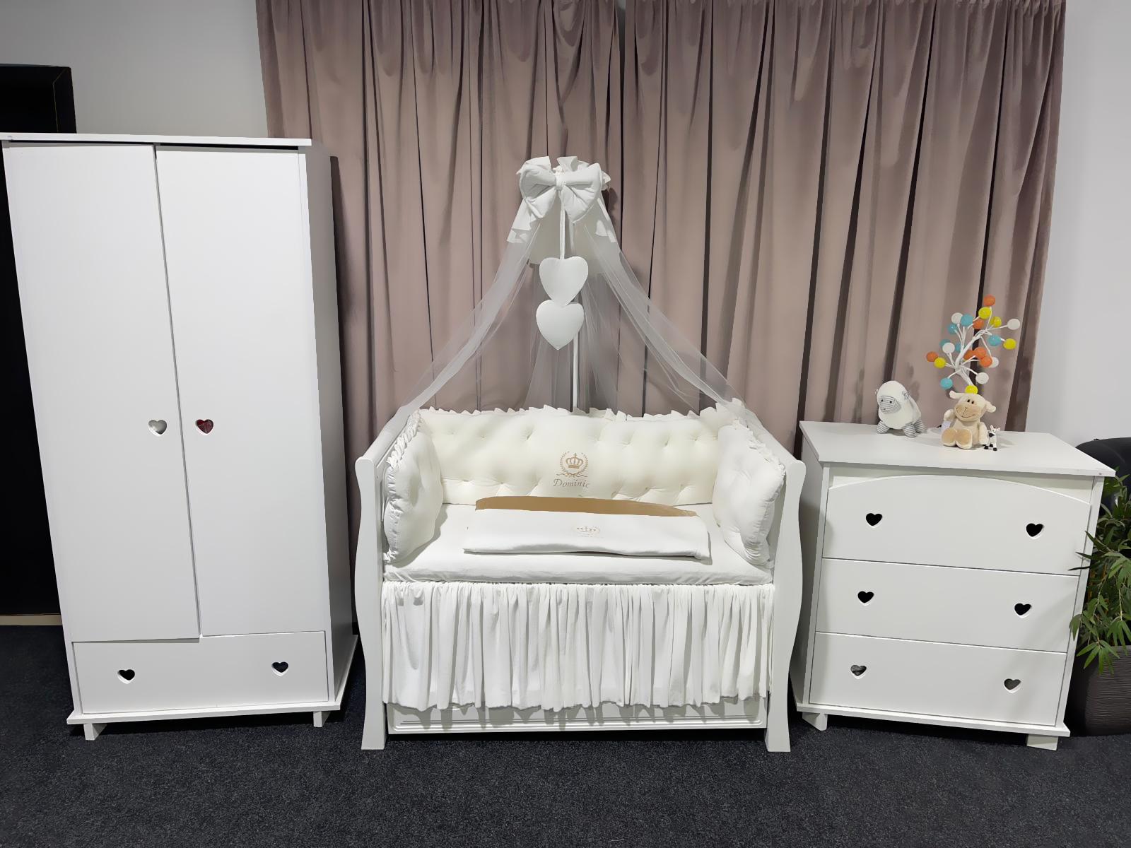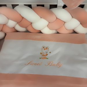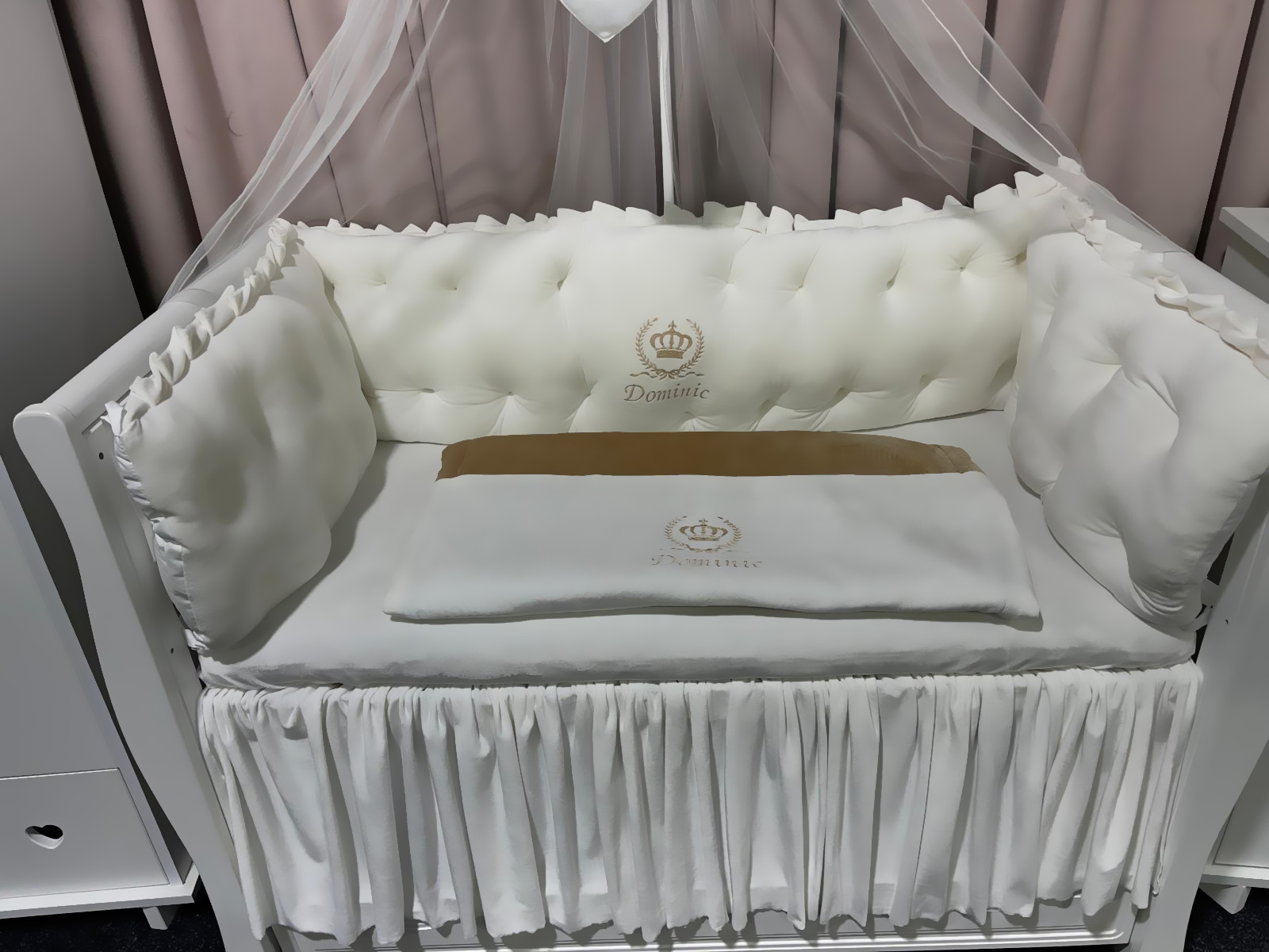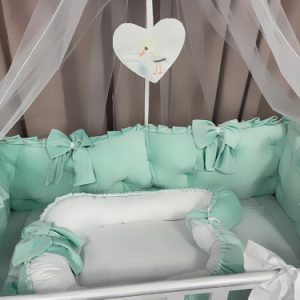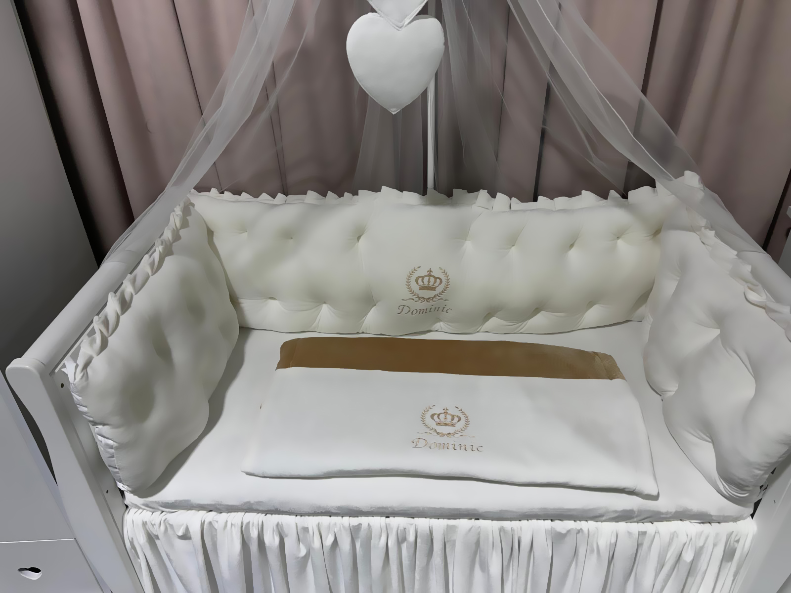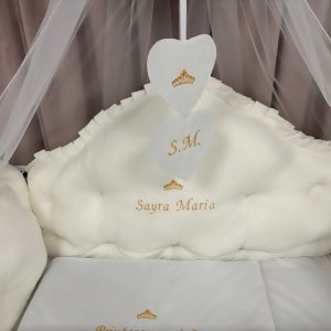 • Include: apărători, pernă, pilotă, pernuțe, codițe, baldachin, fundiță și suport