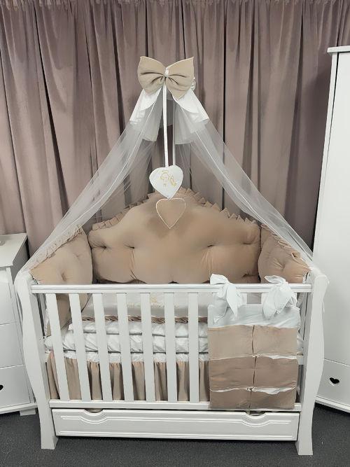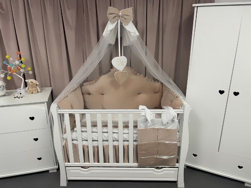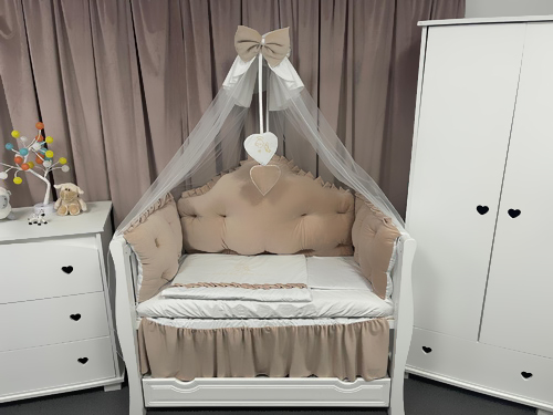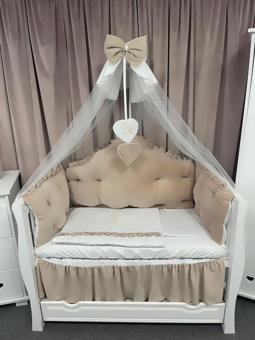 Fiecare element este atent lucrat manual, cu finisaje fine și cusături durabile. Nuanța caldă de bej royal adaugă o notă de rafinament camerei, potrivindu-se perfect atât pentru băieței, cât și pentru fetițe.