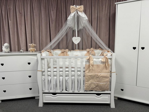 Acest set complet de 11 piese a fost conceput special pentru a oferi bebelușului tău siguranță, confort și rafinament, printr-un design delicat în nuanțe calde de alb și bej.
