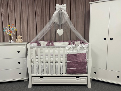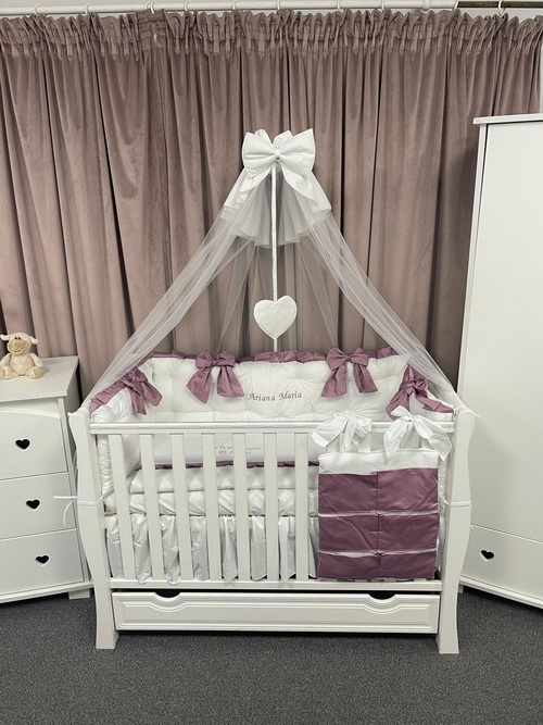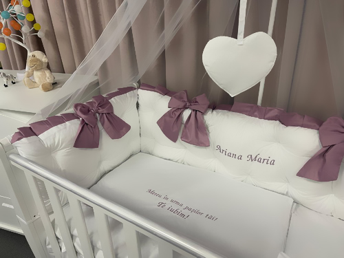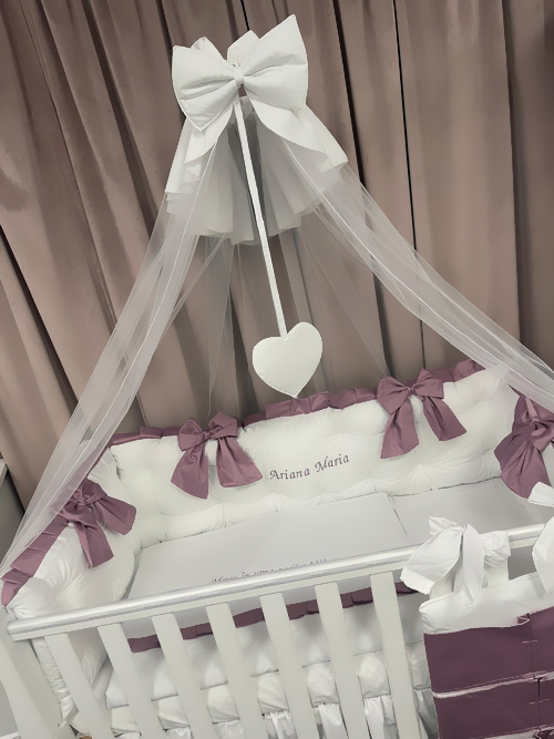 Oferă camerei bebelușului tău o notă de eleganță și rafinament cu setul Royal Catifea White Purple Peppi Bambini, o lenjerie de pătuț premium pentru bebeluși realizată manual în România.