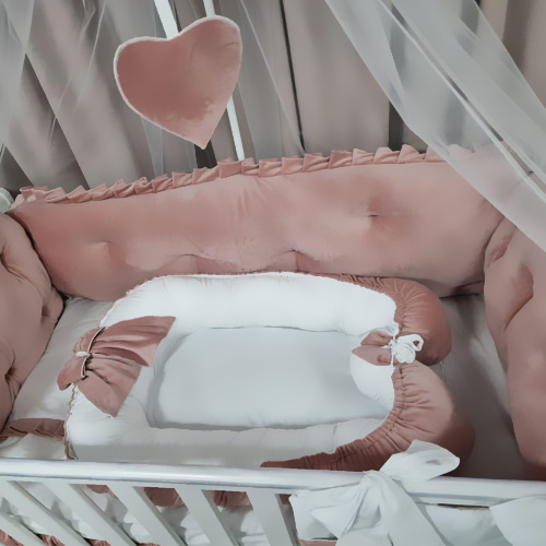 Realizat manual în România din catifea fină și bumbac 100% natural, acest set complet de 11 piese oferă confort, siguranță și o estetică regală, perfectă pentru camera unei mici prințese.