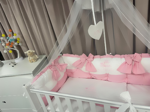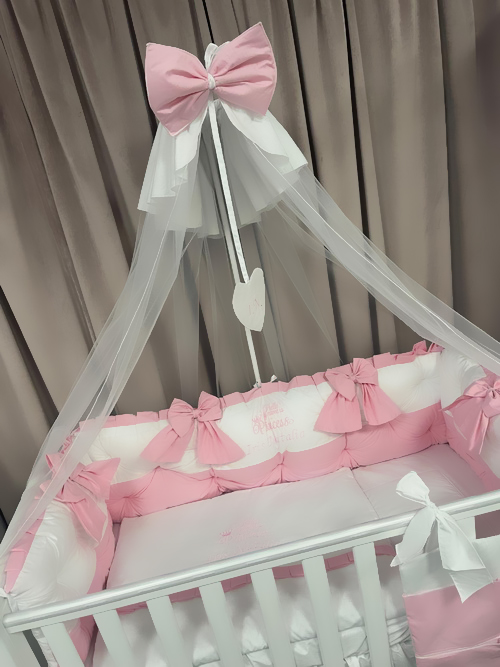 Setul de 11 piese complete combină eleganța designului clasic cu nuanțele delicate de alb și roz pastel, oferind o atmosferă calmă și rafinată în camera copilului.