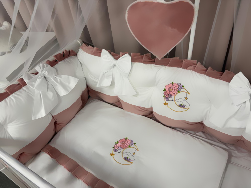 „O lenjerie de pătuț pentru bebeluși de o calitate excelentă! Protecțiile sunt groase, sigure și se prind bine. Culoarea roz pastel e superbă și nu s-a schimbat la spălat.”