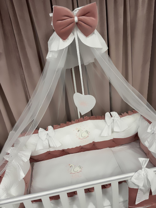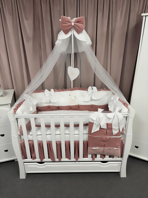 Realizat manual în România din catifea premium și bumbac 100% natural, acest set complet de 11 piese oferă tot ce ai nevoie pentru un pătuț elegant, sigur și plin de căldură.