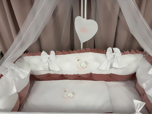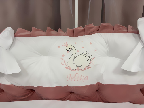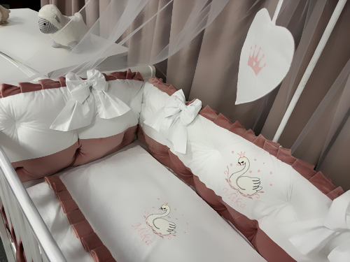 Set complet 11 piese pentru pătuț – model Royal White Pink din catifea fină alb-roz, personalizabil cu nume – Peppi Bambini Premium Collection