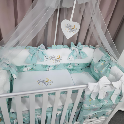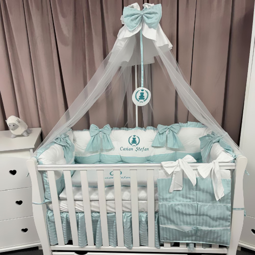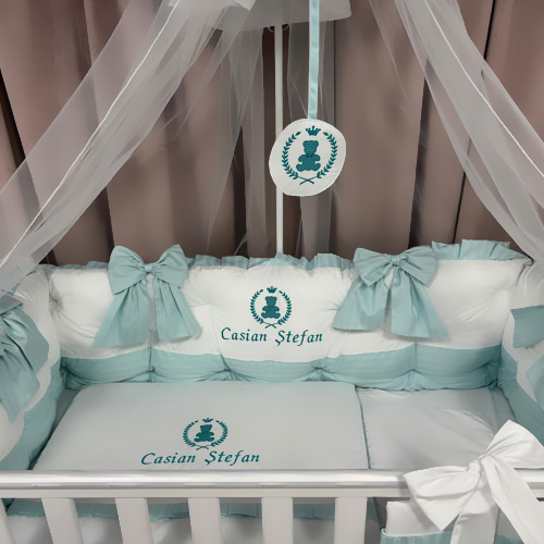 Setul Royal White Mint Casian îmbină tonurile pure de alb cu accente subtile de verde mentă, oferind o senzație calmantă, potrivită pentru somnul liniștit al copilului.
